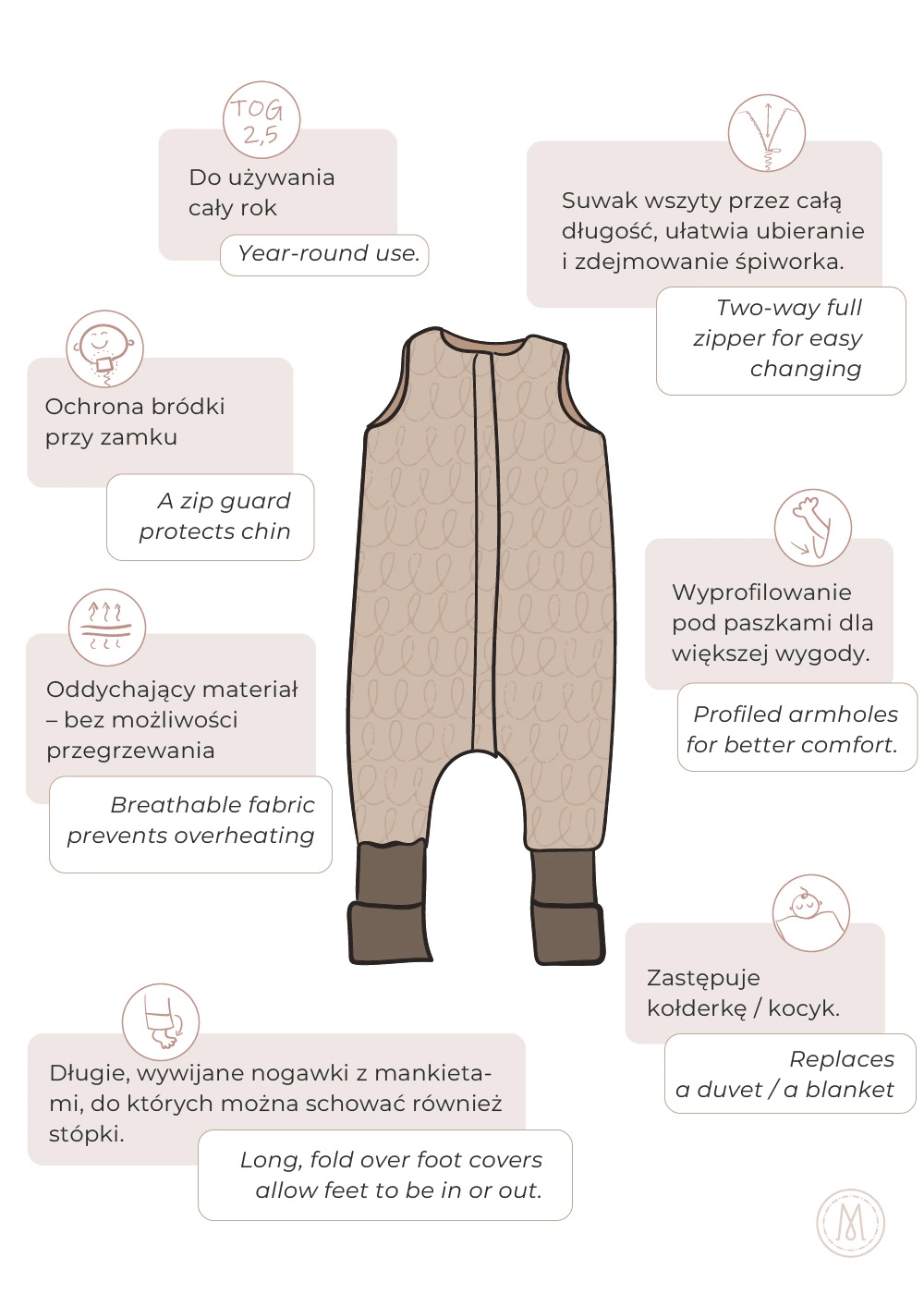 Śpiworek w przedniej części posiada suwak, który można rozpiąć przez całą długość, dzięki czemu łatwo się go ubiera i zdejmuje. Wyprofilowanie pod paszkami sprawia, że dla dziecka śpiworek jest wygodny jak piżamka i nie zsuwa się nawet gdy trzymamy dziecko na rękach. Śpiworek jest skonstruowany tak, by zapewnić dziecku maksimum wygody podczas snu i porannych harców. Gdy Maluszek śpi w śpiworku nie potrzebuje już kołderki, mamy pewność, że nie odkryje się podczas snu, ani nie naciągnie sobie kołderki na twarz. Śpiworek posiada długie nogawki z miękkiego bawełnianego ściągacza, do których dzięki mankietom można schować również stópki.