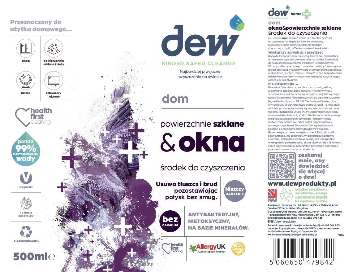 Środek do czyszczenia okien i szklanych powierzchni pojemność 500 ml Usuwa tłuszcz i brud, pozostawiając połysk bez smug. ANTYBAKTERYJNY, NIETOKSYCZNY, NA BAZIE MINERAŁÓW. BEZZAPACHOWY Zamień szkodliwe środki czystości na zdrowsze rozwiązania! Dew to skuteczny, mineralny i ekologiczny środek czyszczący, stworzony z myślą o Twoim zdrowiu i środowisku. wystarczy spryskać i przetrzeć Doskonały do wszystkich powierzchni szklanych i ceramicznych. Produkty Dew nie są szkodliwe dla zdrowia, jeśli są stosowane zgodnie z zaleceniami. Nie ma wymogu stosowania środków ochrony indywidualnej ani konieczności kontroli substancji niebezpiecznych dla zdrowia (COSHH). Sposób użycia: Rozpylić bezpośrednio na suchą ściereczkę z mikrofibry, a następnie wytrzeć powierzchnię do czysta. W przypadku uporczywych osadów może być wymagana druga aplikacja. Przechowywać w temperaturze pokojowej w chłodnym, suchym miejscu. Chronić przed bezpośrednim działaniem promieni słonecznych. Najlepiej zużyć w ciągu 6 miesięcy od otwarcia.