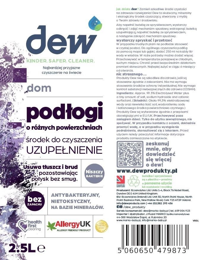 Środek do czyszczenia podłóg uzupełnienie o pojemności 2,5 litra Usuwa tłuszcz i brud, pozostawiając połysk bez smug. ANTYBAKTERYJNY, NIETOKSYCZNY, NA BAZIE MINERAŁÓW. BEZZAPACHOWY Zamień szkodliwe środki czystości na zdrowsze rozwiązania! Dew to skuteczny, mineralny i ekologiczny środek czyszczący, stworzony z myślą o Twoim zdrowiu i środowisku. wystarczy spryskać i przetrzeć Skuteczny preparat do czyszczenia podłóg, przeznaczony do usuwania trudnych plam i codziennego utrzymania czystości na różnych powierzchniach podłogowych. Produkty Dew nie są szkodliwe dla zdrowia, jeśli są stosowane zgodnie z zaleceniami. Nie ma wymogu stosowania środków ochrony indywidualnej ani konieczności kontroli substancji niebezpiecznych dla zdrowia (COSHH). Sposób użycia: W przypadku trudnych plam na podłodze stosować w czystej postaci. Do ogólnego czyszczenia podłóg za pomocą mopa lub gąbki, dodać 250 ml na każdy litr wody w wiadrze. W razie potrzeby można dodać więcej. Przechowywać w temperaturze pokojowej w chłodnym, suchym miejscu. Chronić przed bezpośrednim działaniem promieni słonecznych. Najlepiej zużyć w ciągu 6 miesięcy od otwarcia. Uzupełnienie: Aby napełnić butelkę ze spryskiwaczem, wystarczy odkręcić i zdjąć mechanizm spustowy, wstrząsnąć butelką uzupełniającą, napełnić butelkę ze spryskiwaczem, a następnie zakręcić mechanizm spustowy.