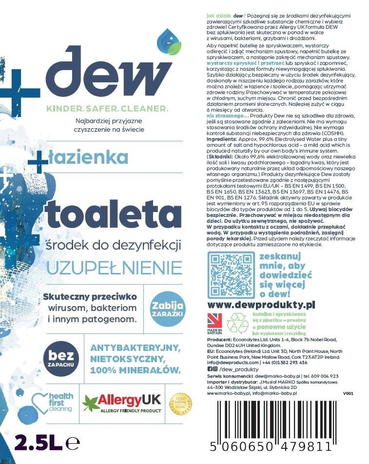 Środek do czyszczenia łazienki - toaleta uzupełnienie o pojemności 2,5 litra Skuteczny przeciwko wirusom, bakteriom i innym patogenom. ANTYBAKTERYJNY, NIETOKSYCZNY, 100% MINERAŁÓW. BEZZAPACHOWY Pożegnaj się ze środkami dezynfekującymi zawierającymi szkodliwe substancje chemiczne i wybierz zdrowie! Certyfikowana przez Allergy UK formuła DEW, niewymagająca spłukiwania, jest skuteczna w ponad 99,99% w walce z wirusami, bakteriami, grzybami i drożdżami. wystarczy spryskać i przetrzeć To szybko działający, bezpieczny w użyciu środek dezynfekujący, doskonały w zwalczaniu wszystkich rodzajów bakterii, które możesz znaleźć w łazience i toalecie, pomagając utrzymać zdrowie Twojej rodziny. Przechowywać w chłodnym, suchym miejscu, w temperaturze pokojowej. Chronić przed bezpośrednim działaniem promieni słonecznych. Najlepiej zużyć w ciągu 6 miesięcy od otwarcia. Produkty Dew nie są szkodliwe dla zdrowia, jeśli są stosowane zgodnie z zaleceniami. Nie ma wymogu stosowania środków ochrony indywidualnej ani konieczności kontroli substancji niebezpiecznych dla zdrowia (COSHH). Sposób użycia: Wystarczy spryskać i przetrzeć lub spryskać i zapomnieć, korzystając z naszej formuły bez spłukiwania. Przed użyciem wstrząsnąć. Przechowywać w chłodnym, suchym miejscu, w temperaturze pokojowej. Chronić przed bezpośrednim działaniem promieni słonecznych. Najlepiej zużyć w ciągu 6 miesięcy od otwarcia. Uzupełnienie: Aby napełnić butelkę ze spryskiwaczem, wystarczy odkręcić i zdjąć mechanizm spustowy, wstrząsnąć butelką uzupełniającą, napełnić butelkę ze spryskiwaczem, a następnie zakręcić mechanizm spustowy.