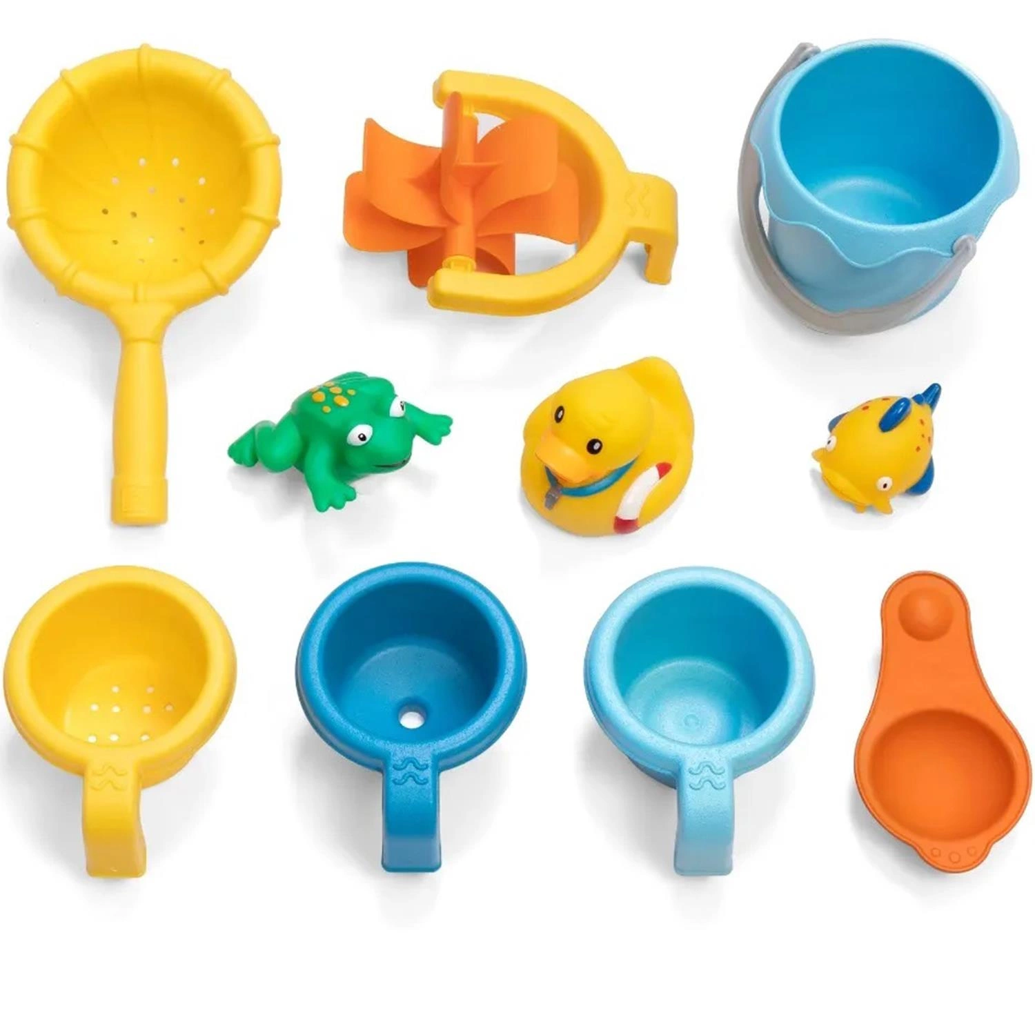 Wszechstronna zabawa w wodzie zaczyna się od uroczego dziecięcego stołu wodnego. Spraw sobie przyjemność dzięki zabawie w wodzie. Dwustronna taca tworzy realistyczny efekt deszczu – wystarczy wlać wodę, aby zabawa się zaczęła! Woda z tacy umieszczona na górze tworzy realistyczny efekt deszczu. Z jednej strony przelewa się także ona do wiadra które po napełnieniu się obraca i wylewa wodę, zaś z drugiej strony jest rynienka która kieruje wodę wprost na wirujący wiatraczek. Zestaw posiada także wyskocznie dla zwierzątek, uchwyt na wiaderko oraz sitko. Całość ląduje w brodziku na samym dole.