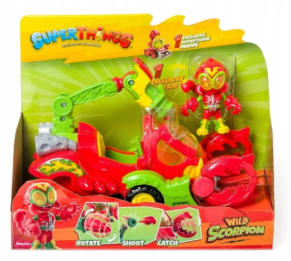 Dzięki potężnym zwierzęcym atakom i wykwalifikowanym pilotom rozpoczyna się najdzikszy pojedynek! Odkryj pełną moc skorpiona,z ekskluzywnym Wild Kidem i SuperThingiem, których miejsce jest w kokpicie. Wild Scorpion ma pazury do łapania rywali, które obracają się w trakcie ruchu. Ponadto może strzelać do Bohaterów za pomocą potężnego żądła!
