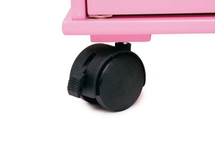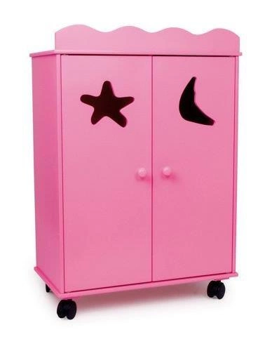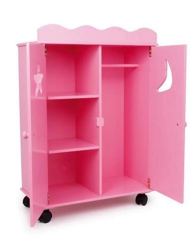 Ładna na różowy kolor lakierowana szafa na kółkach pomieści bez problemu ubranka lalek. Drzwi szafy ozdobione wycięciami w kształcie księżyca i gwiazdki. Szafa z jednej strony ma trzy półki, z drugiej strony drążek na wieszaki.