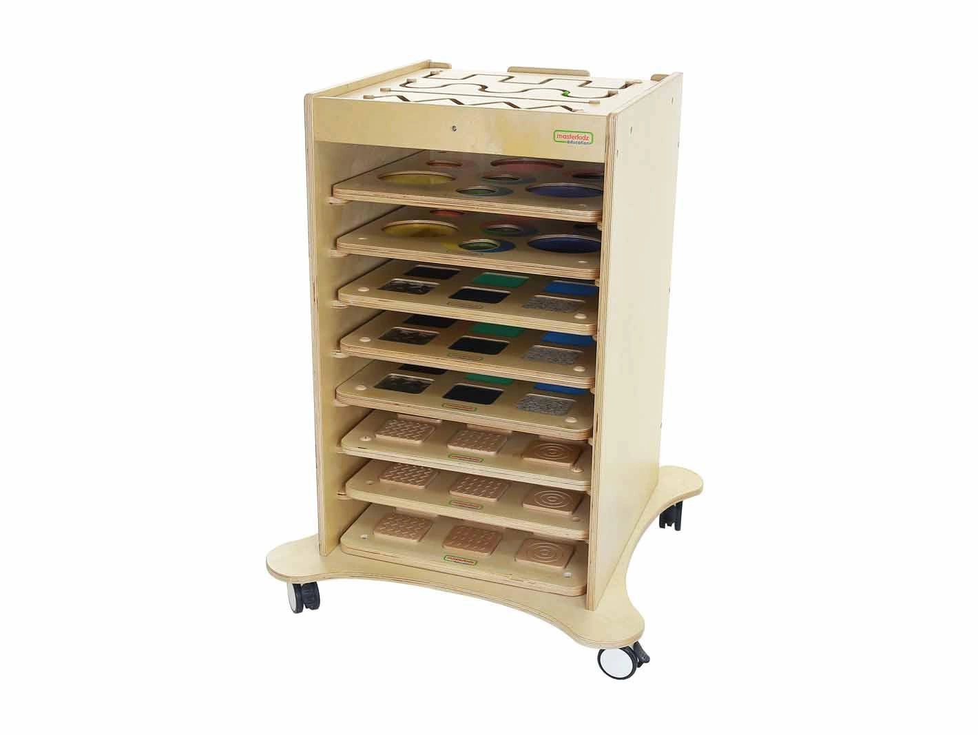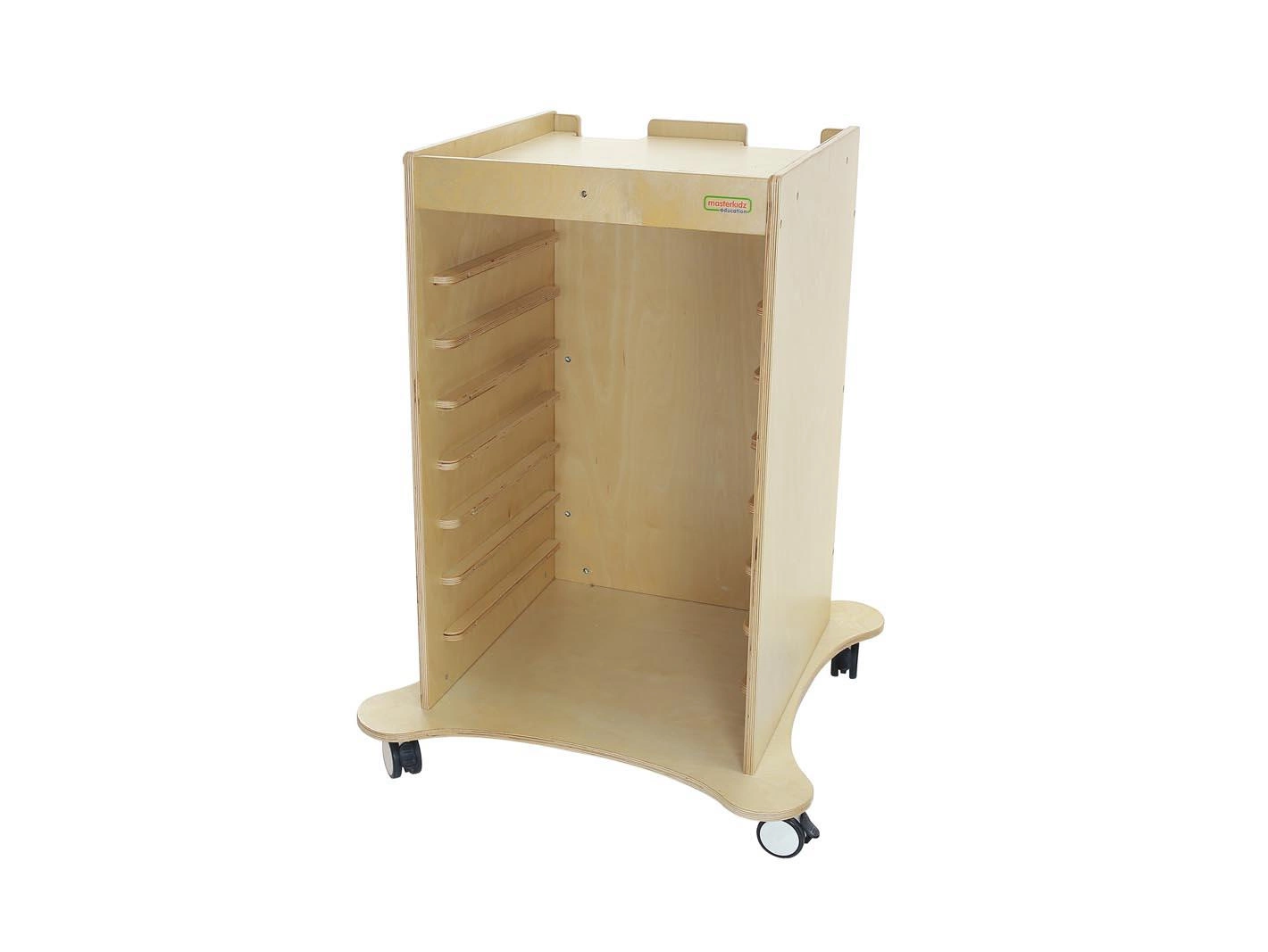 Mobilna szafka na kółkach do przechowywania tablic ściennych Masterkidz to świetny mebel, który pozwoli na zachowanie należytego porządku wśród ściennych tablic edukacyjnych od Masterkidz o wymiarach 46x46cm - mieści ich aż 9.