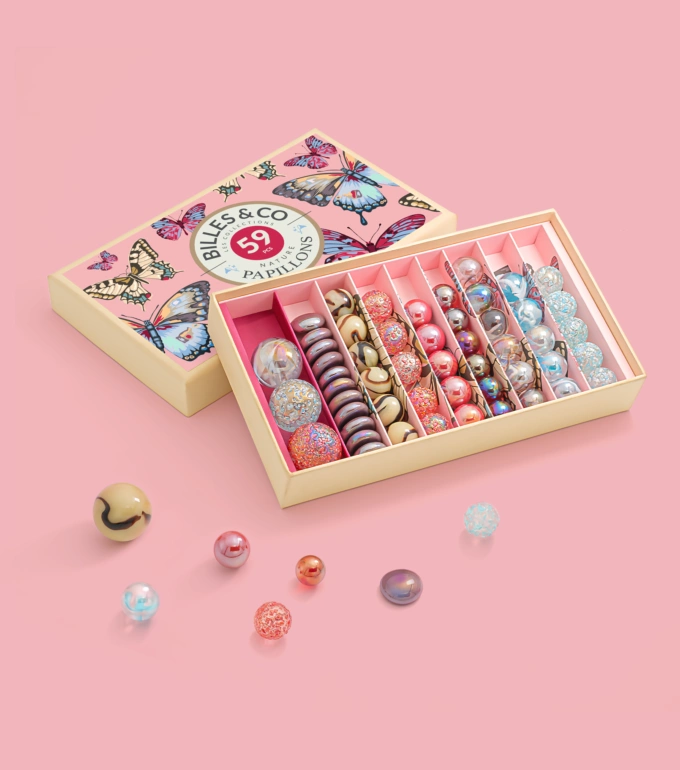 Billes&Co RÓŻOWE MOTYLE to zestaw 59 szklanych kulek i kamyczków, kolorystycznie ułożonych w pięknie zdobionym pudełku. Przeróżne barwy, tekstury i wzory kulek posiadają hipnotyzującą moc, która nie pozwoli oderwać się od zabawy. Kulki są ułożone tematycznie, tworząc w małych pudełeczkach swoiste uniwersa.