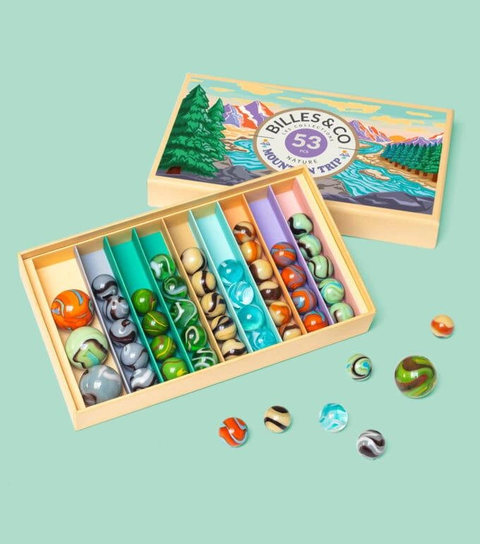 Billes&Co WYPRAWA W GÓRY to zestaw 53 szklanych kulek i kamyczków, kolorystycznie ułożonych w pięknie zdobionym pudełku. Przeróżne barwy, tekstury i wzory kulek posiadają hipnotyzującą moc, która nie pozwoli oderwać się od zabawy. Kulki są ułożone tematycznie, tworząc w małych pudełeczkach swoiste uniwersa.