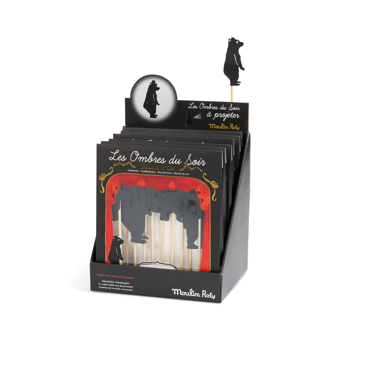 Teatrzyk cienij marki Moulin Roty. Zestaw zawiera laserowo wycinane postacie ze znanej i lubianej bajki o 3 misie i Złotowłosa. Gdy nadejdzie wieczór, czas na przedstawienie, które rozbudzi wyobraźnię dzieci.