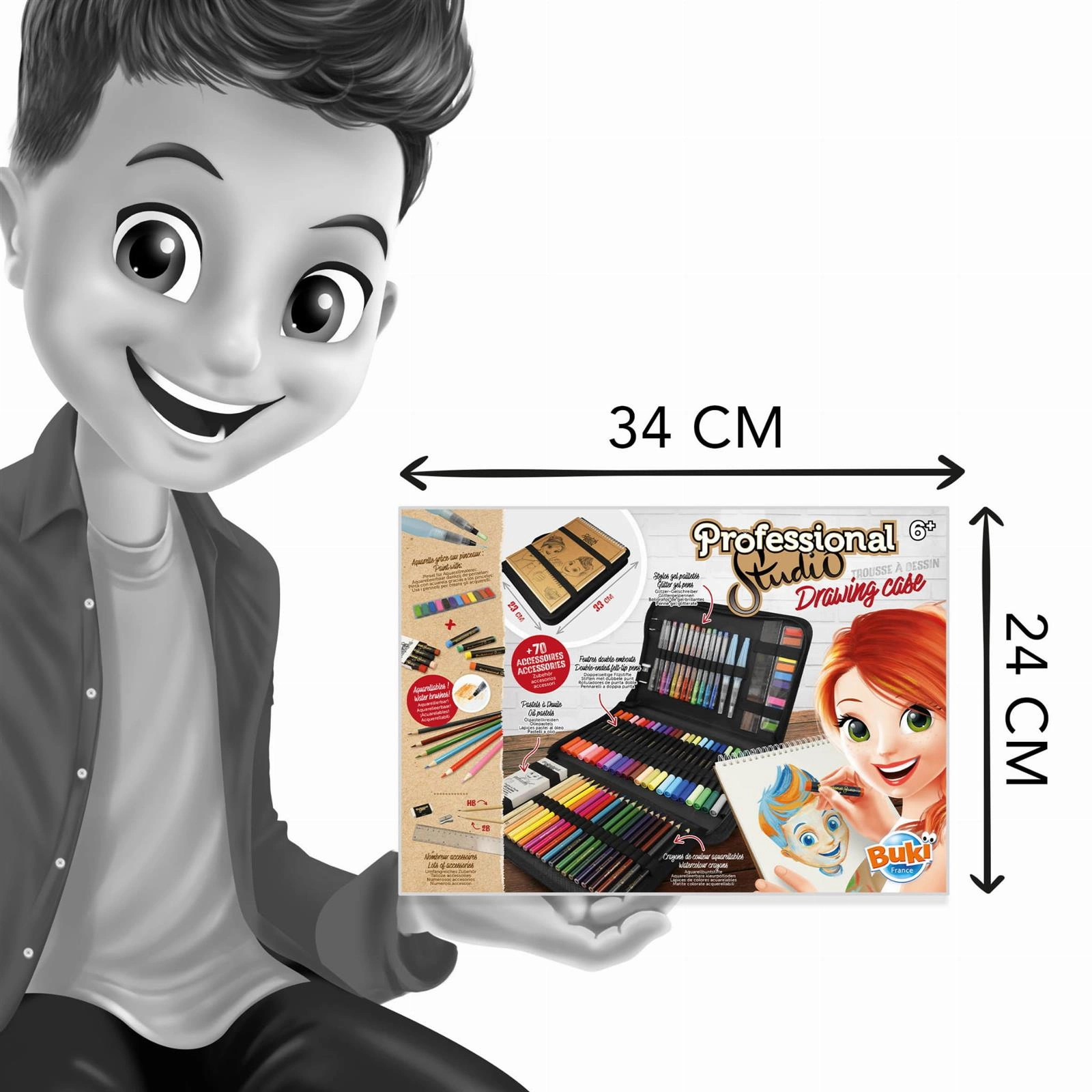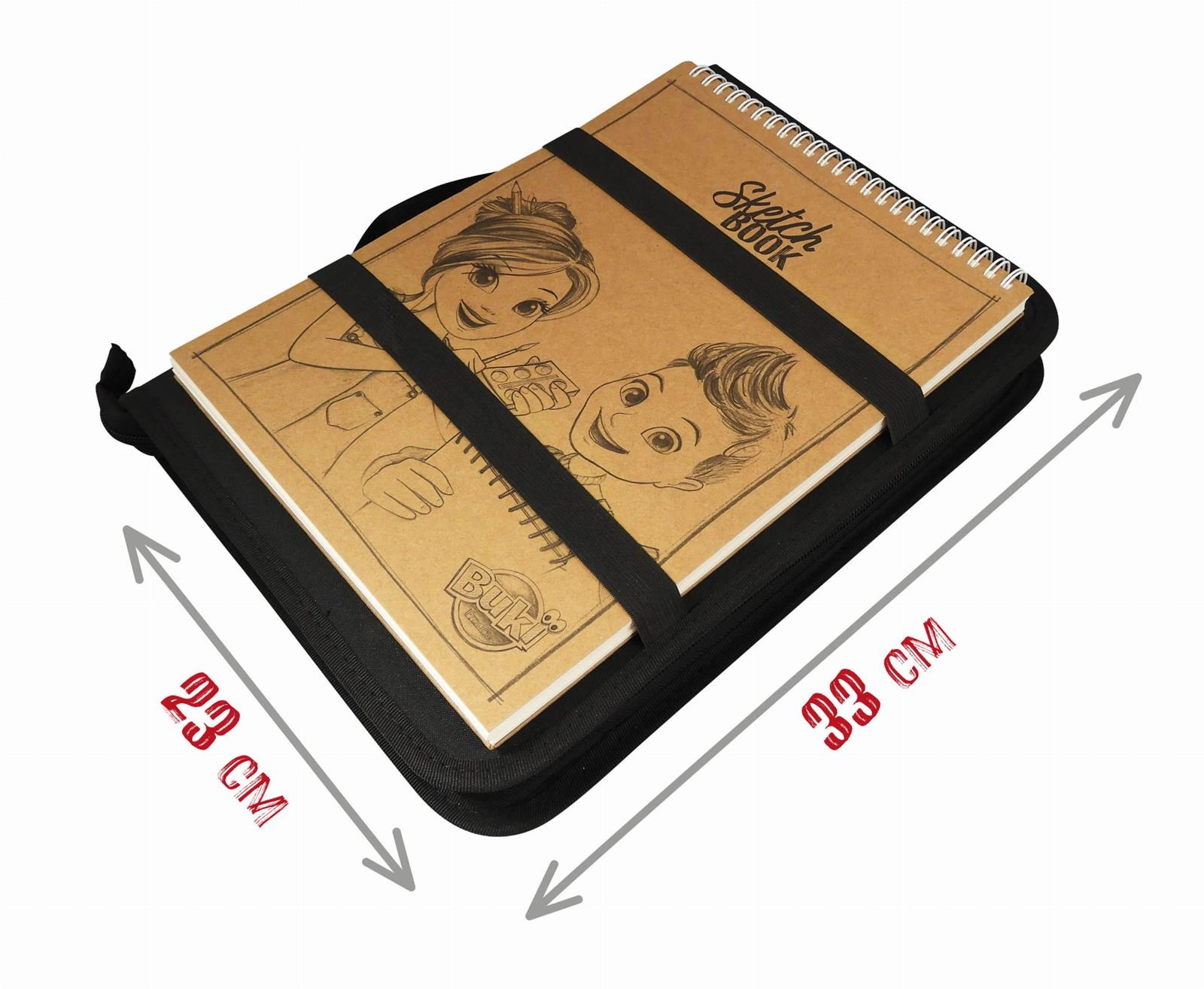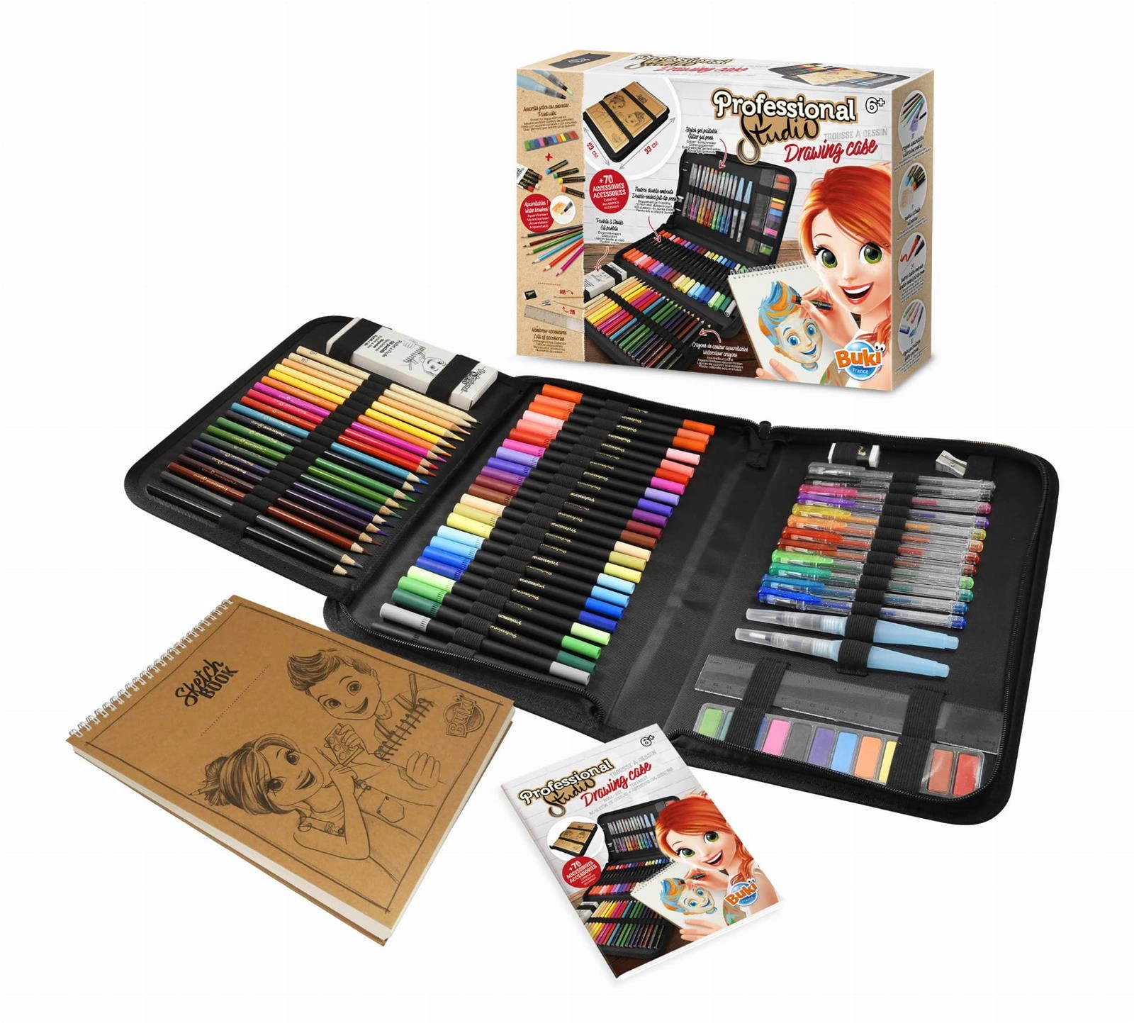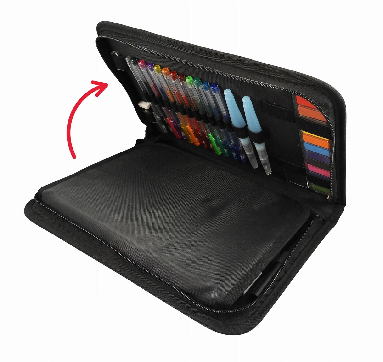 Bogato wyposażona teczka z akcesoriami plastycznymi i szkicownikiem pozwoli rozwinąć kreatywność małego artysty. Ponad 70 różnych narzędzi, które pozwolą stworzyć niepowtarzalne dzieła w szkicowniku na spirali dołączonym do zestawu. Wszystkie materiały: pastele, farbki, kredki i inne mieszczą się w teczce w formie piórnika. Teczka zamykana jest na zamek i posiada uchwyt do noszenia. Każdą kredkę lub mazak wkłada się do wyznaczonych miejsc. Szkicownik wsuwa się z przodu teczki pod elastyczne gumki, zapobiegające jego wypadnięciu. Dzięki tym zabezpieczeniom teczkę można zabrać ze sobą wszędzie oraz jest łatwa do przechowywania.