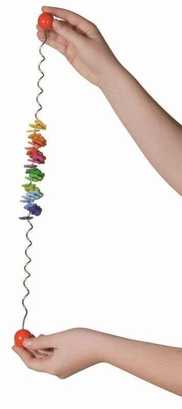 Tęczowe kwiatki dzięki przesuwaniu się na krętym pręciku wytwarzają delikatny dźwięk. Dodatkowo podczas opadania drewnianych elementów na dno spirali wytwarzany jest wyjątkowy efekt wizualny, który przykuje uwagę każdego dziecka. Z pewnością zabawka odnajdzie swoje zastosowanie obok deszczowej tuby w przedstawieniu szkolnym, a może również podczas indywidualnej zabawy w domu.