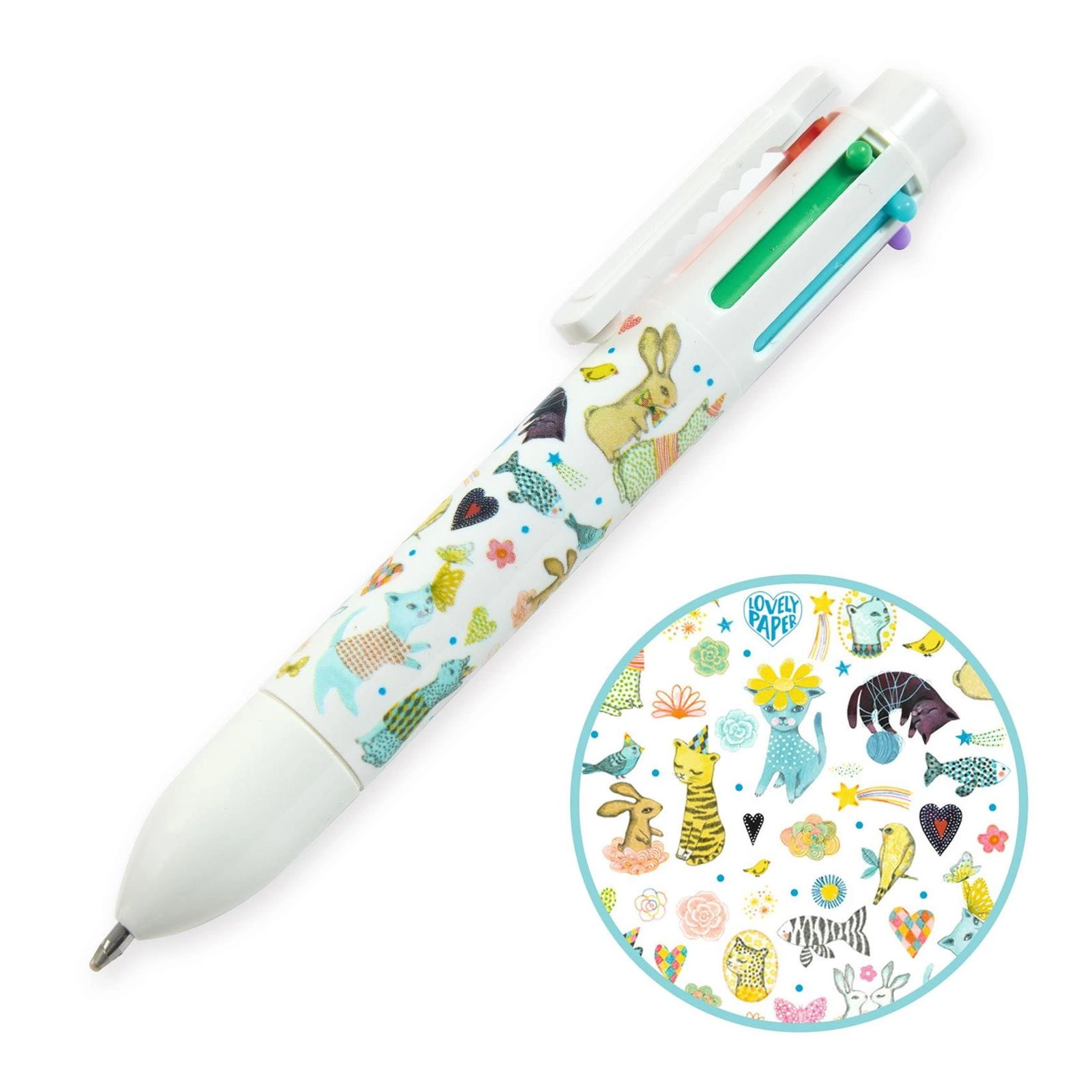 Tęczowy długopis żelowy, posiada 6 różnych kolorowych wkładów: różowy, czerwony, fioletowy, niebieski, zielony i pomarańczowy. Obudowa długopisu ma charakterystyczną dla Djeco grafikę małych elementów, nawiązującą do innych produktów z kolekcji LOVELY PAPER.