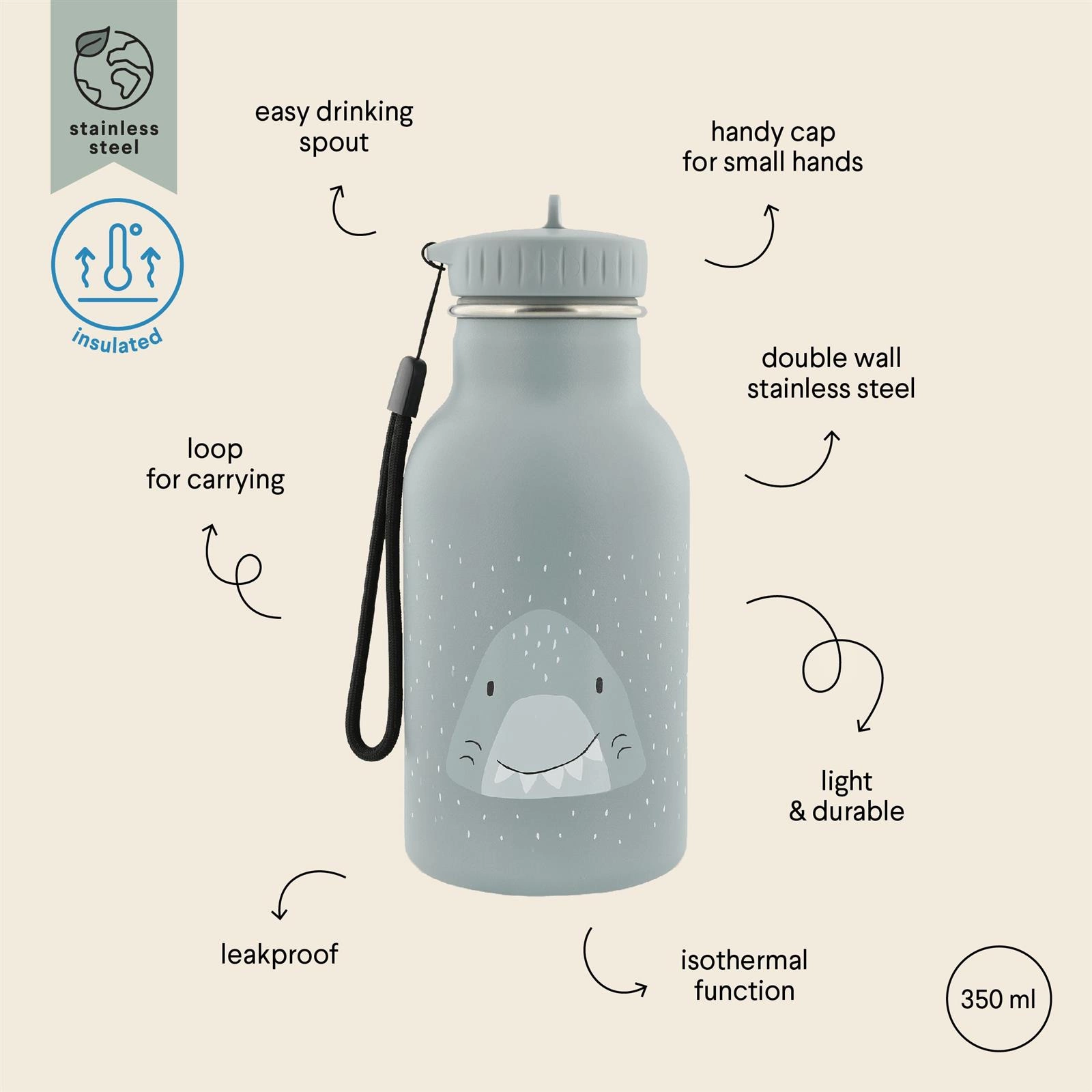 Materiał: butelka: 100% stal nierdzewna zakrętka: 100% PP sznurek: 100% PES Zalecany wiek: 3 lata+ Wymiary: 7.5 x 7.5 x 17.5 cm Pojemność: 350 ml