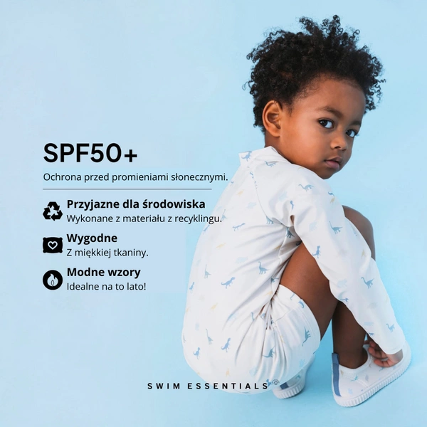 Swimsuit Dino Rashguard 98/104 od The Swim Essentials. Wykonany z wysokiej jakości tkaniny, która zapewnia doskonałą ochronę przed promieniowaniem UV na poziomie UPF 50+. Dzięki temu Twój maluch może cieszyć się całymi dniami na zewnątrz, a Ty nie musisz się martwić o ryzyko poparzeń słonecznych. Wygodny suwak z przodu zapewnia łatwe zakładanie a napy u dołu ułatwią wymianę pieluszki, długie rękawki to lepsze zabezpieczenie przed promieniowaniem UV. Przygotuj swojego malucha na wspaniałe lato i sprawdź pozostałe akcesoria do pływania i zabawy w wodzie od The Swim Essentials.