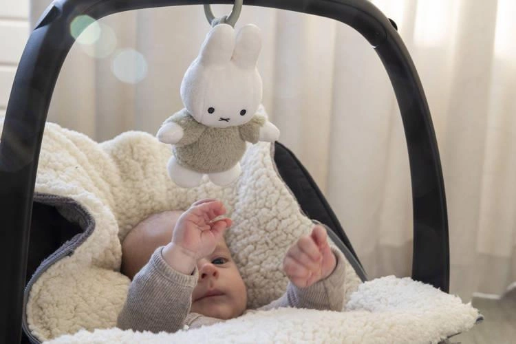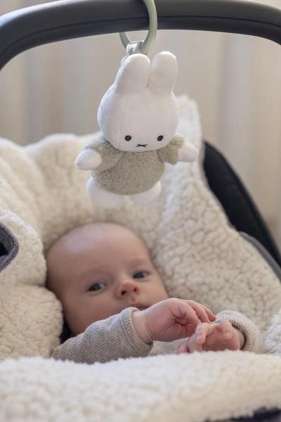 Miffy Wibrująca zawieszka Fluffy Green od Tiamo. Zawieszka w kształcie króliczka Miffy po pociągnięciu zaczyna delikatnie wibrować. Jest to niezwykle interesujące dla dziecka i zachęca je do wspólnej zabawy. Dzięki pierścieniowi zawieszkę można łatwo przyczepić do fotelika samochodowego czy gondoli wózka. Jest niezwykle urocza i mięciutka. Zabawka pozytywnie wpływa na koordynację ręka-oko dziecka. Stanowi świetne uzupełnienie dla pozostałych zabawek dla niemowląt Tiamo z kolekcji Fluffy.