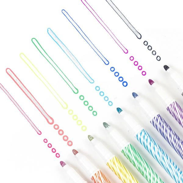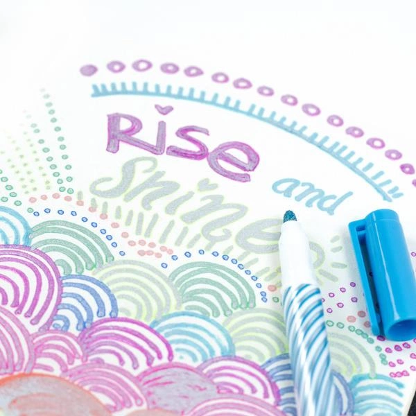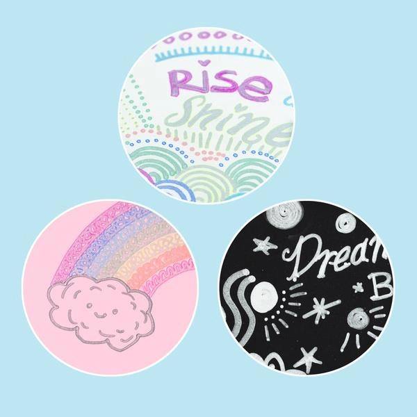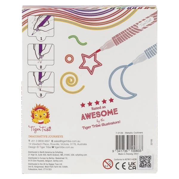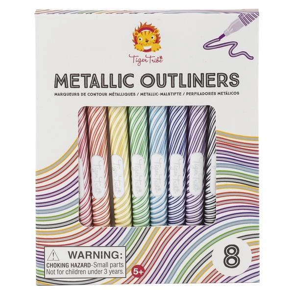 Magiczne Markery Metaliczne od Tiger Tribe to zestaw ośmiu pisaków skonstruowanych tak, aby za jednym pociągnięciem uzyskać niezwykły efekt dwukolorowego wzoru. W każdym pisaku znajduje się super lśniący metaliczny srebrny tusz, obramowany kontrastującym kolorem. Markery nadają się do stosowania na wielu powierzchniach, w tym na kamieniach czy drewnie. Idealne do ozdobnych napisów, projektów szkolnych i artystycznych, wpisów do dziennika i kartek okolicznościowych.