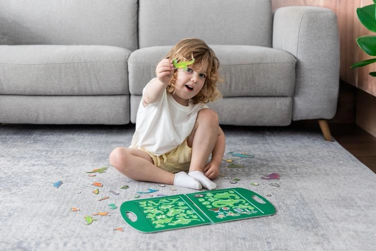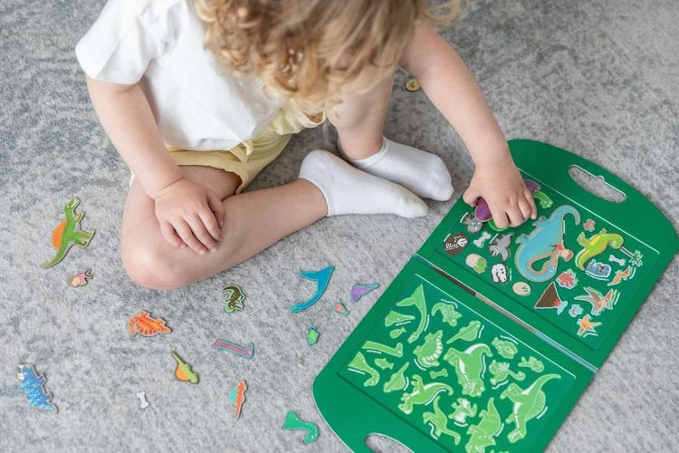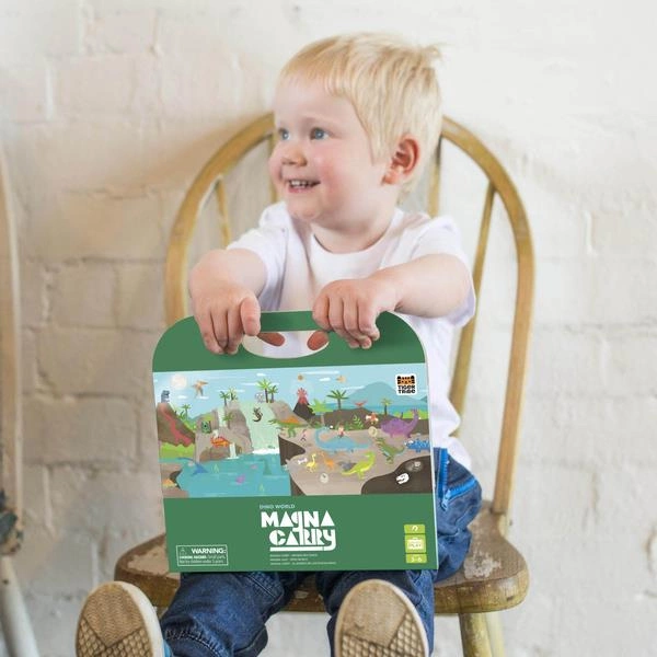 Przenośne Magnesy - Świat Dinozaurów od Tiger Tribe to przenośna magnetyczna plansza z całą masą obrazków do zabawy. Spłyń wodospadem, eksploruj wybuchający wulkan, zajmij się jajkiem dinozaura! Mnóstwo prehistorycznych postaci do zabawy, w tym mały triceratops czy pływający plezjozaur. Twórz nowe scenki przy każdej zabawie. A gdy skończysz, pakowanie jest super zabawne dzięki układance „dopasuj magnesy” na pudełku. 1,2,3 i posprzątane! Magnesy zostały zaprojektowane i zilustrowane w Australii przez zespół Tiger Tribe. Zestaw pomaga rozwijać wyobraźnię i umiejętności motoryczne, jednocześnie zachęcając do samodzielnej zabawy. Każdy zestaw zawiera 2 arkusze magnesów i jest przenośny - łatwy do złożenia i zabrania ze sobą.