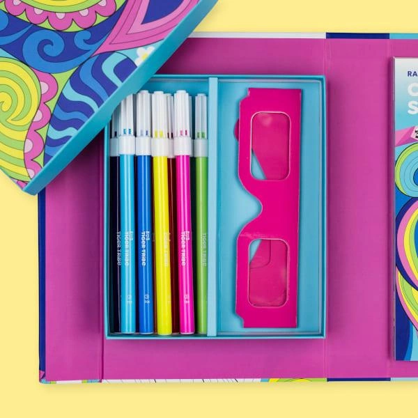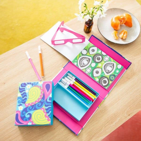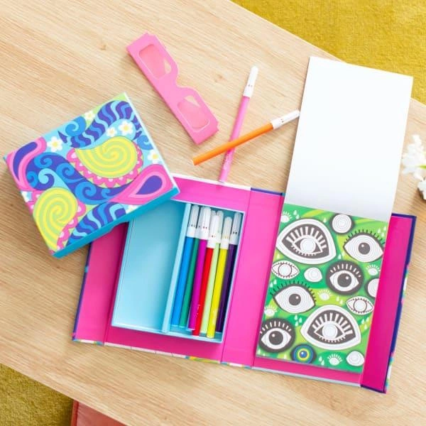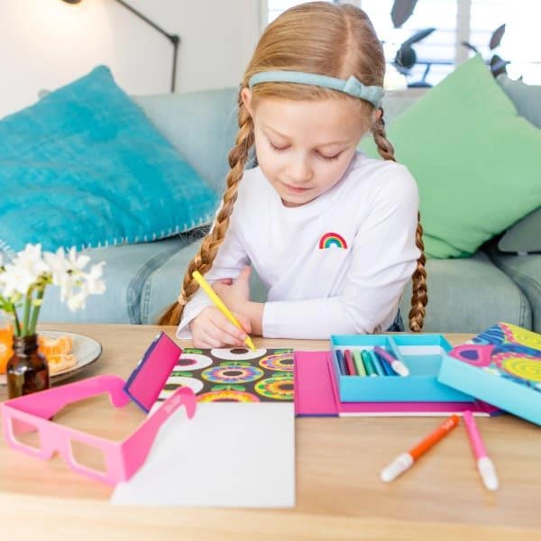 Zestaw Kolorowanek 3D – Tęczowe Sny od Tiger Tribe to fantastyczny zestaw kreatywny do tworzenia trójwymiarowych obrazów. Przenieś swoje kolorowanie do następnego wymiaru i stwórz niesamowite iluzje optyczne. Po prostu pokoloruj (używając zasady ciepła/zimna*), załóż specjalne okulary 3D i zobacz, jak Twoje dzieło sztuki wyskakuje ze strony! Zestaw pełen retro kolorowanek, został zaprojektowany tak, aby Tygryski były zajęte w podróży - w jednym pudełku z magnetyczną klapką, aby bezpiecznie przechowywać zawartość. Zaprojektowane z myślą o przenośnej zabawie zestawy do kolorowania Tiger Tribe stanowią świetną alternatywę dla czasu spędzonego przed ekranem, promując uważność, relaks i odprężające zajęcie.