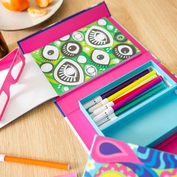 Skład zestawu: 36 stron do kolorowania, 10 flamastrów, okulary 3D, magnetyczne pudełko do przechowywania