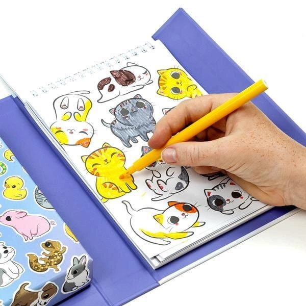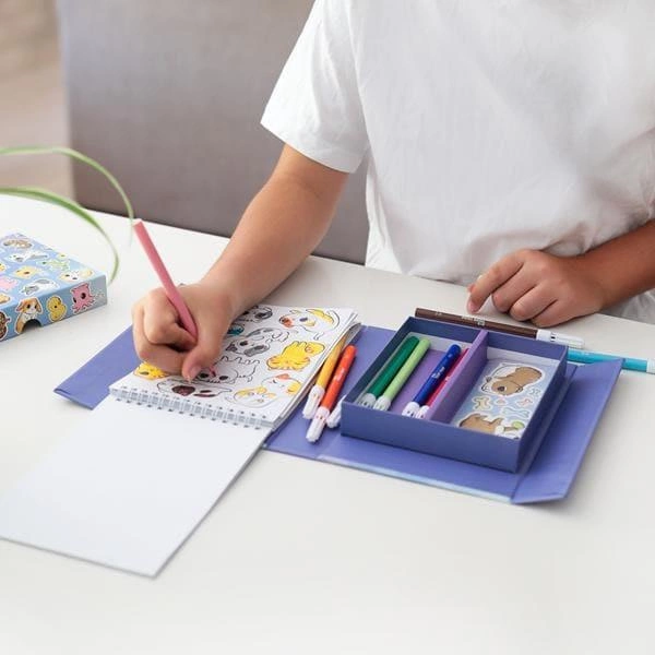 Skład zestawu: 36 stron do kolorowania, 10 flamastrów, 5 arkuszy naklejek, magnetyczne pudełko do przechowywania