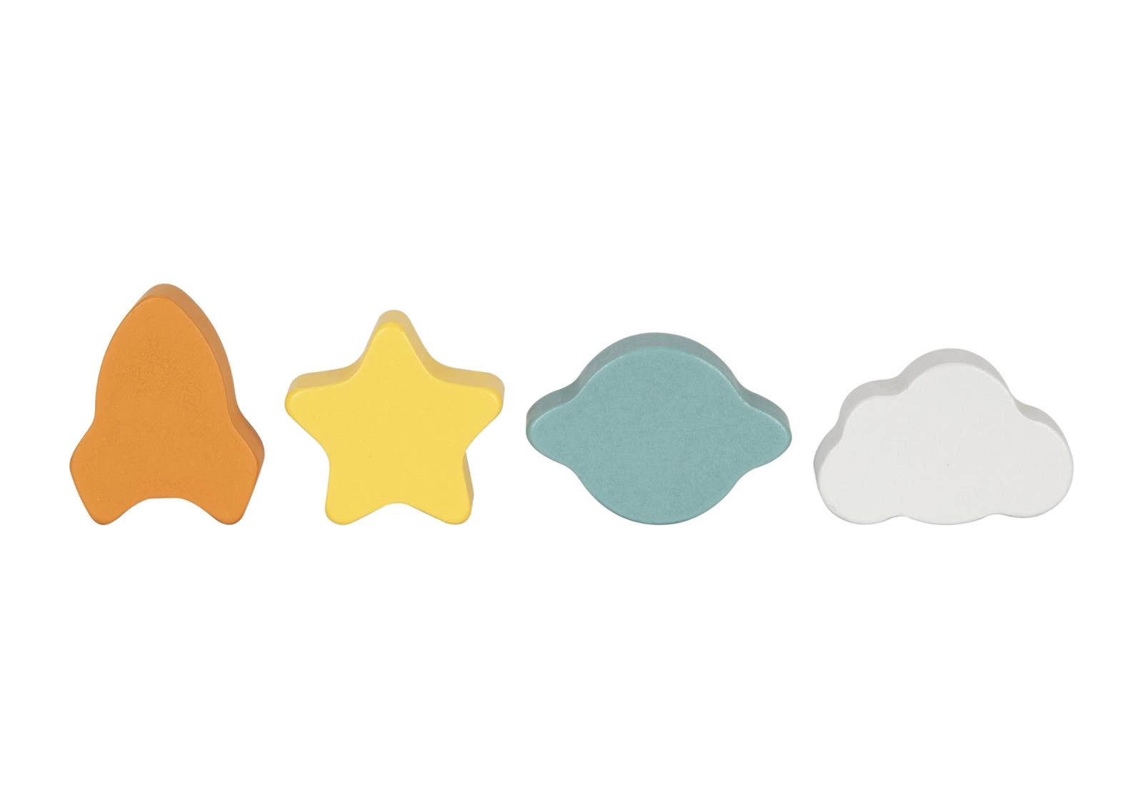 - Otwory w kształcie planety, gwiazdki, rakiety i chmurki stworzone specjalnie do sortowania klocków. Dziecko może bawić się kształtami, doskonaląc jednocześnie umiejętności logicznego myślenia.