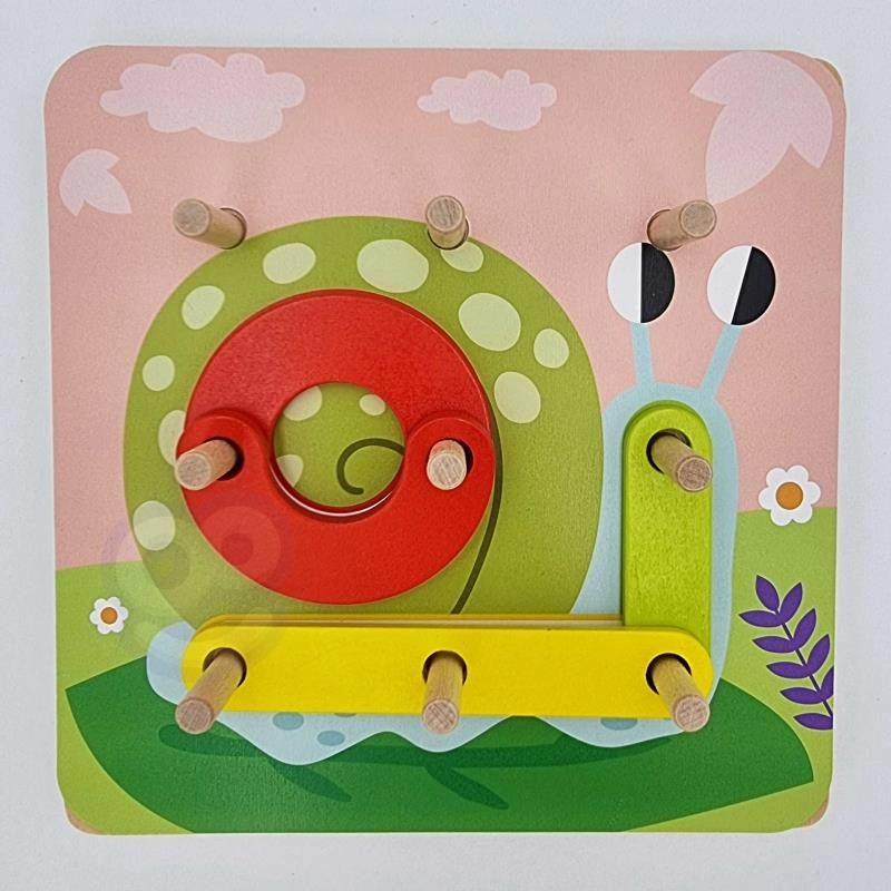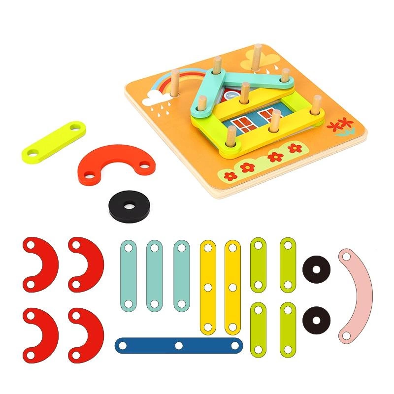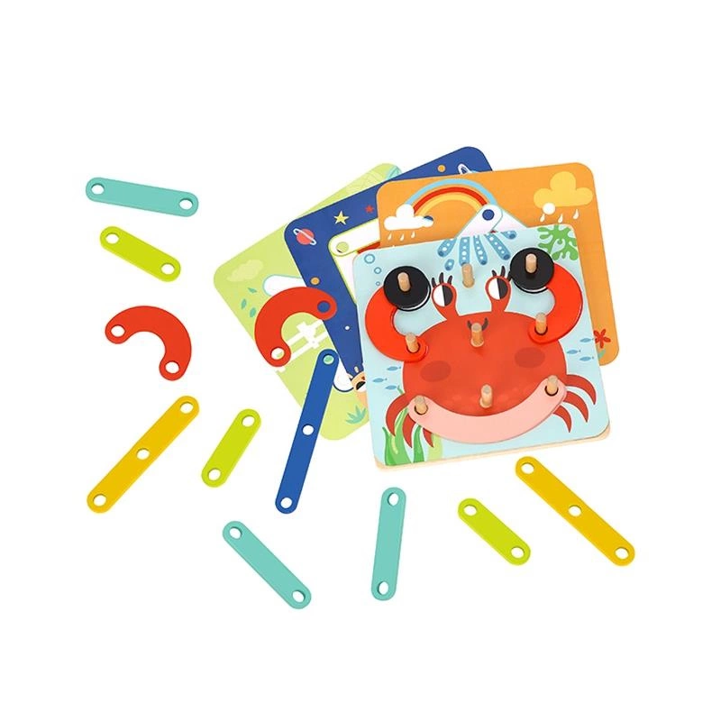 Drewniana Układanka od marki TOOKY TOY to gra kreatywności i wyobraźni. W tej grze dzieci starają się dopasować do siebie kształty, odtwarzając obraz karty. Na drewnianej podstawce z kołkami należy umieścić obraz zwierzęcia i dobrać do niego takie elementy, aby pasowały do części zwierzęcia. Zabawka rozwija zdolności manualne, koncentracje oraz zapamiętywanie.