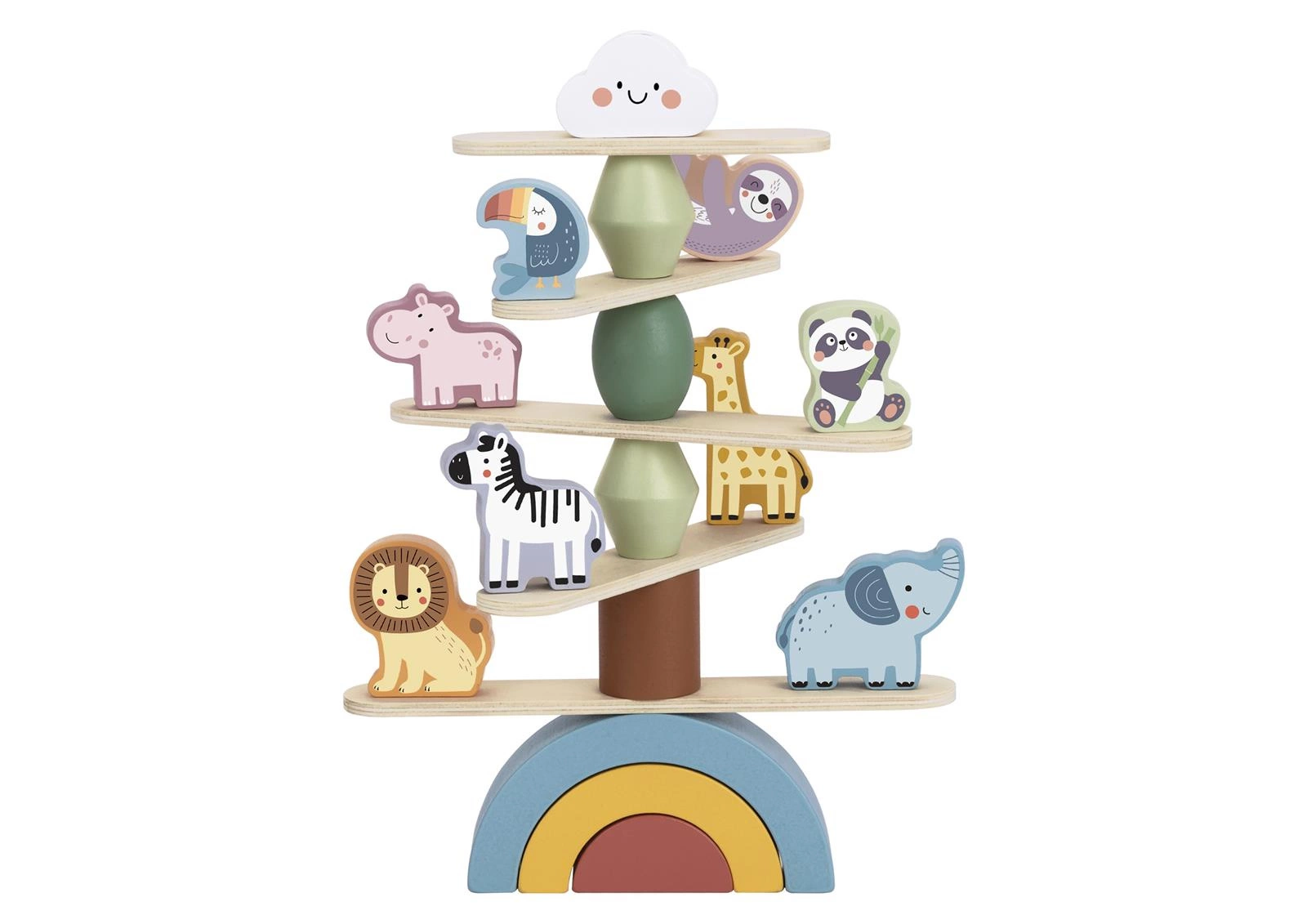 Drewniane zwierzęta do układania w stosy od marki Tooky Toy to ekscytująca i edukacyjna zabawka , która promuje wyobraźnię w zabawie i poprawia umiejętności motoryczne. Zestaw zawiera 12 drewnianych zwierzątek i 16 akcesoriów do balansowania w postaci drewnianej tęczy, kamieni i platform oraz uroczą chmurkę. Dzięki bogatemu wyposażeniu dzieci mogą wymyślać różne małe i duże zrównoważone budowle. W zestawie znajduje się także książeczka z przykładami budowli, dzieci mogą budować według nich lub wymyślać własne, rozwijając kreatywność. Układanka posiada trzy poziomy trudności dla dzieci w każdym wieku. Utrzymuj równowagę, obliczaj każdy ruch, bądź zręczny i dokładny , a wtedy będziesz w stanie zbudować ogromną balansującą wieżę ze zwierzątkami.