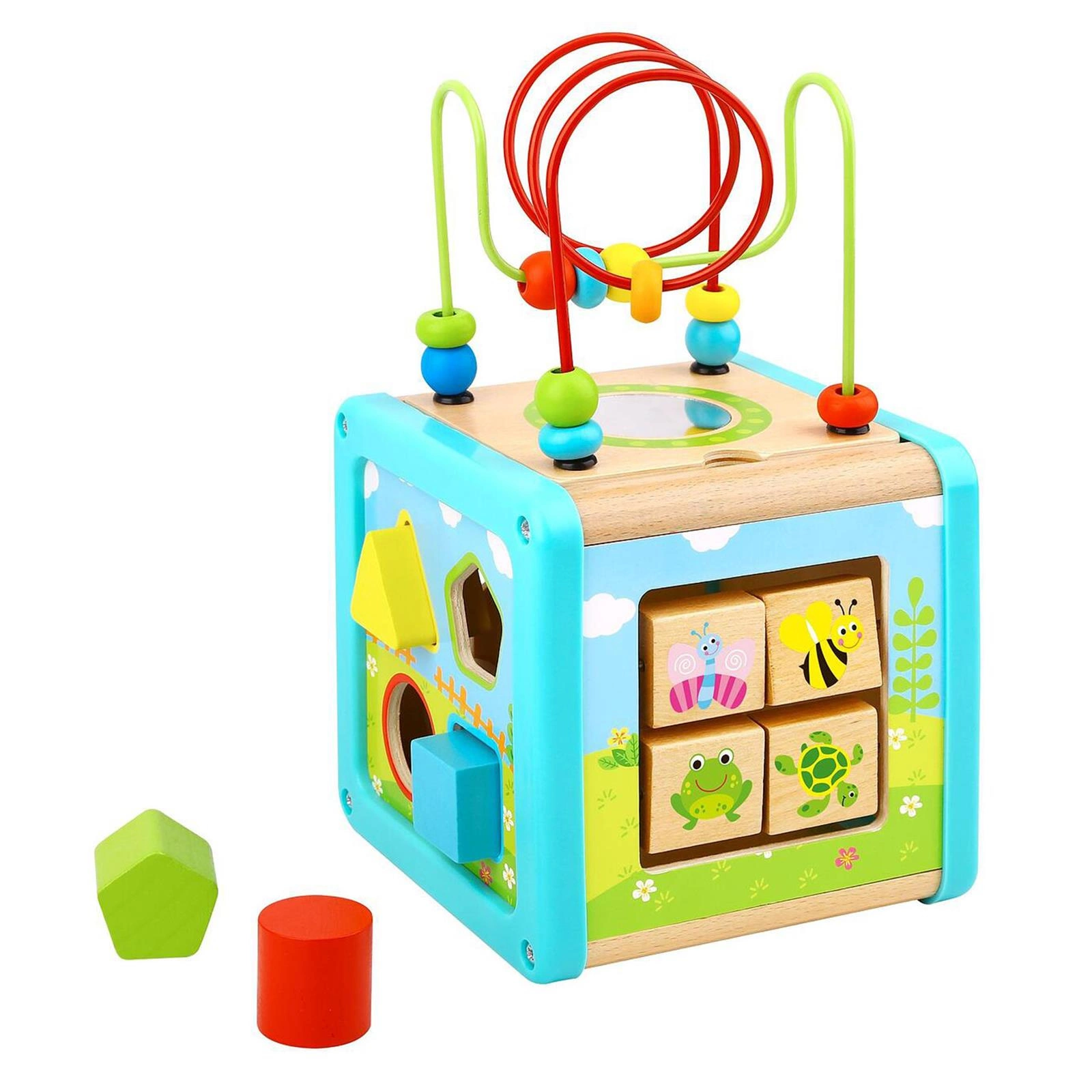- - zabawka składa się z 5 różnych form aktywności: pętlę motoryczną, sorter, obracane klocki ze zwierzątkami, koła zębate i labirynt