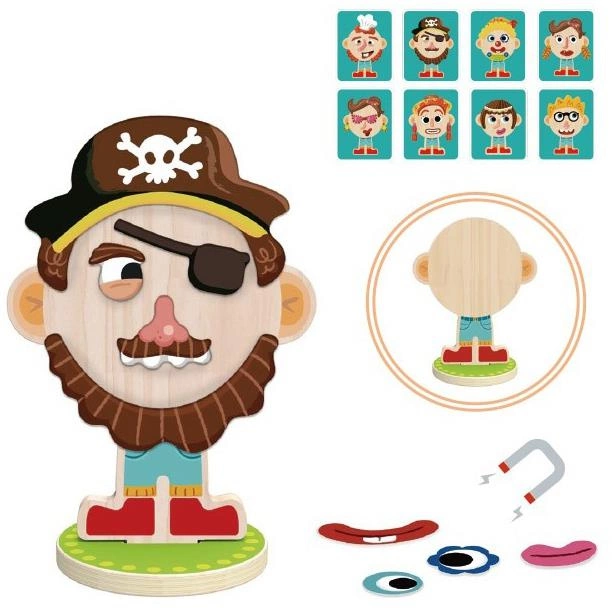 Gra "Zgadnij kim jestem" w nietypowej odsłonie od firmy Tooky Toy! Drewniana figurka częściowo wypełniona metalem, do której dodano aż 55 magnetycznych elementów. Zestaw zawiera dodatkowo 8 kart ze wzorami do ubierania figurki. Przeciwnik zgaduje kim jesteś, a później zmiana! Świetna gra, która rozwija dziecięcą wyobraźnię, a przy okazji sprawność manualną przy ubieraniu figurki.
