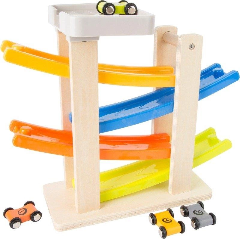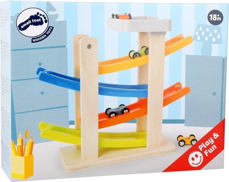 Tor dla samochodów Salto Small foot zbudowany jest z drewnianej solidnej podstawy, która utrzymuje kolorowe plastikowe rampy. Na samej górze znajduje się parking dla drewnianych autek, od malucha zależy który rozpocznie wyścig, ale warto przy tym poćwiczyć cyferki namalowane na dachu. Pojazdy zjeżdżają po wyznaczonych torach, przy zmianie rampy wykonują salto i poruszają się dalej w dół. Który samochodzik zjedzie szybciej?