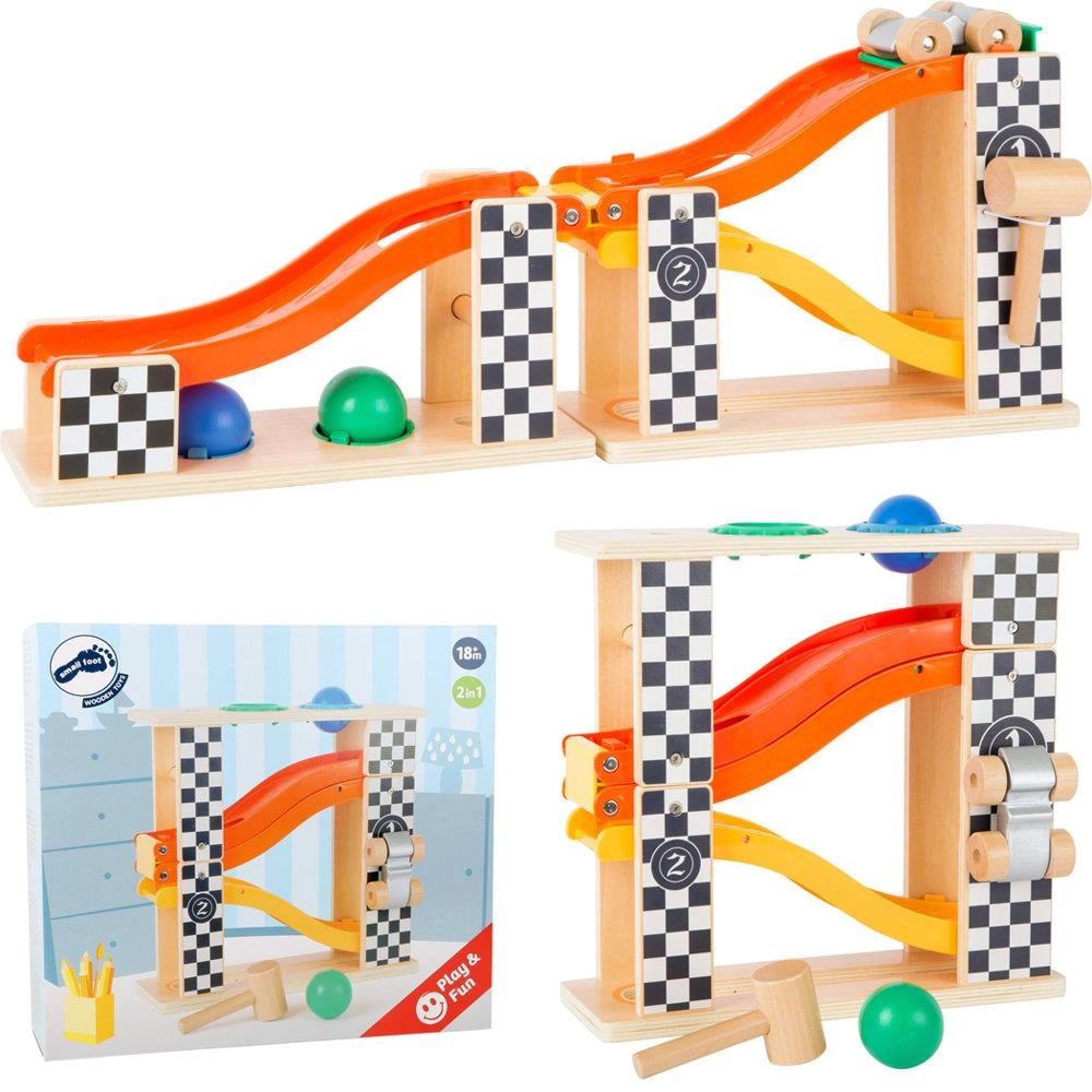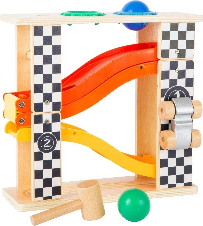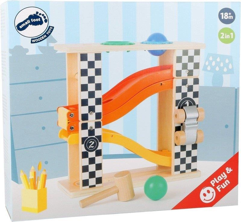 Produkt Small foot po rozłożeniu tworzy fantastyczną trasą do rozgrywek ścigającego się autka, który dołączone jest do zestawu. Natomiast, gdy tylko złożymy nasz komplet możemy przy użyciu solidnego młotka pchnąć kulki i obserwować jak turlają się po rampach i przeciskają się w otworach.