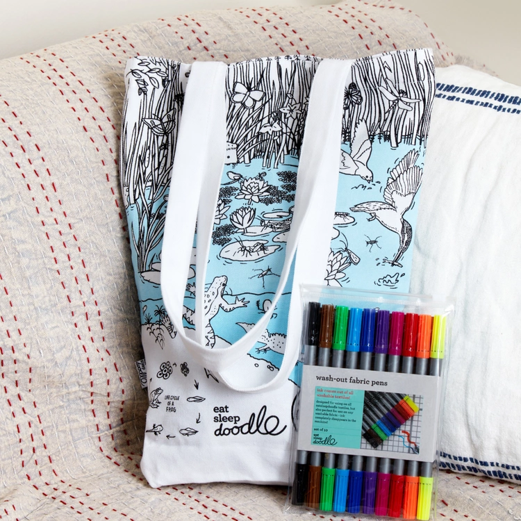 Torba z ręcznie narysowaną przyrodniczą sceną ze stawu, która jest gotowa do wypełnienia kolorami przez Ciebie lub Twoje dziecko, za pomocą 10 zmywalnych pisaków dołączonych do zestawu. Praktyczny, modny i oryginalny element stylizacji z pewnością nie umknie uwadze obserwatorów