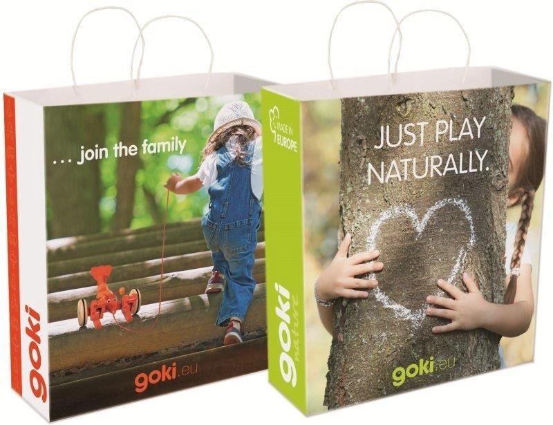 Pakiet pakowany po 100. Torba na prezent Rodzina i natura Goki to wygodne opakowanie na zabawki z tej marki. Nowy styl, nowa jakość. Zdjęcie prezentuje przód oraz tył tej samej torby.