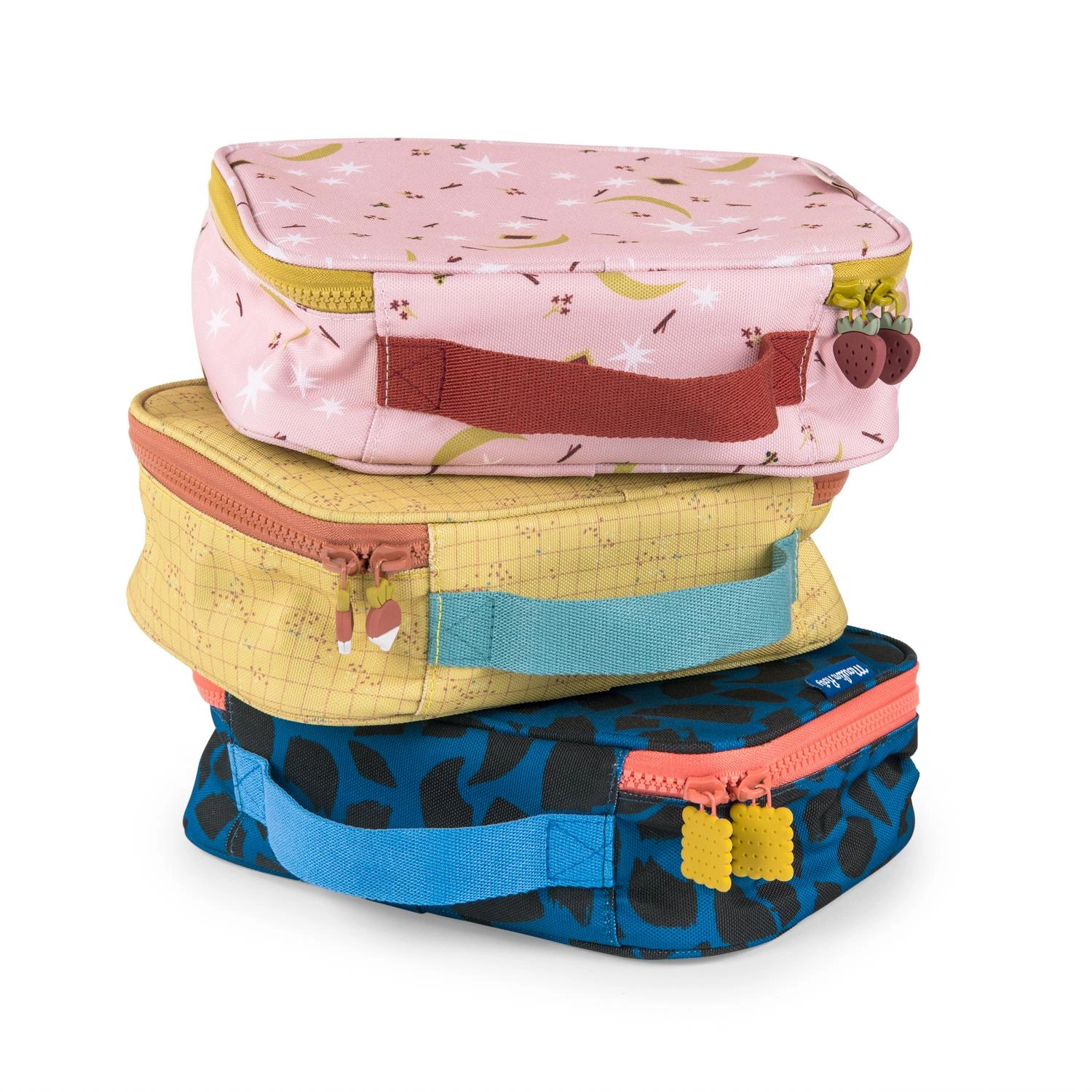 Torba termiczna w kolorze musztardowym w kratkę i drobny wzór pochodzący z kolekcji Trzy Małe Króliczki. W środku posiada turkusową kieszonkę ilustrowaną chmurką, do której można włożyć np. sztućce. Torba jest zamykana na zamek w kontrastowym łososiowym kolorze, który jest zwieńczony uroczymi przywieszkami w kształcie rzodkiewek.
