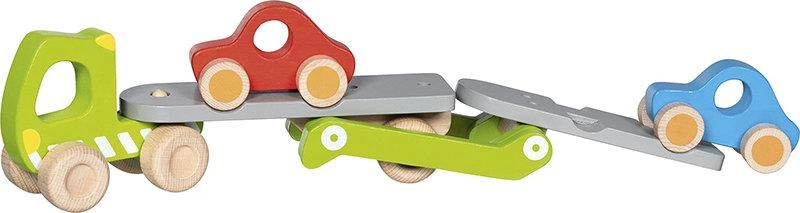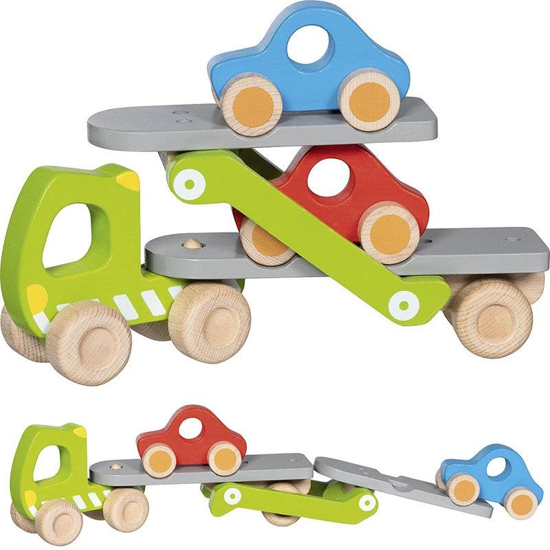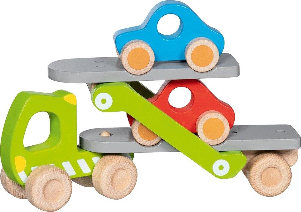 Transporter samochodowy laweta drewniana i 2 autka Goki 55860