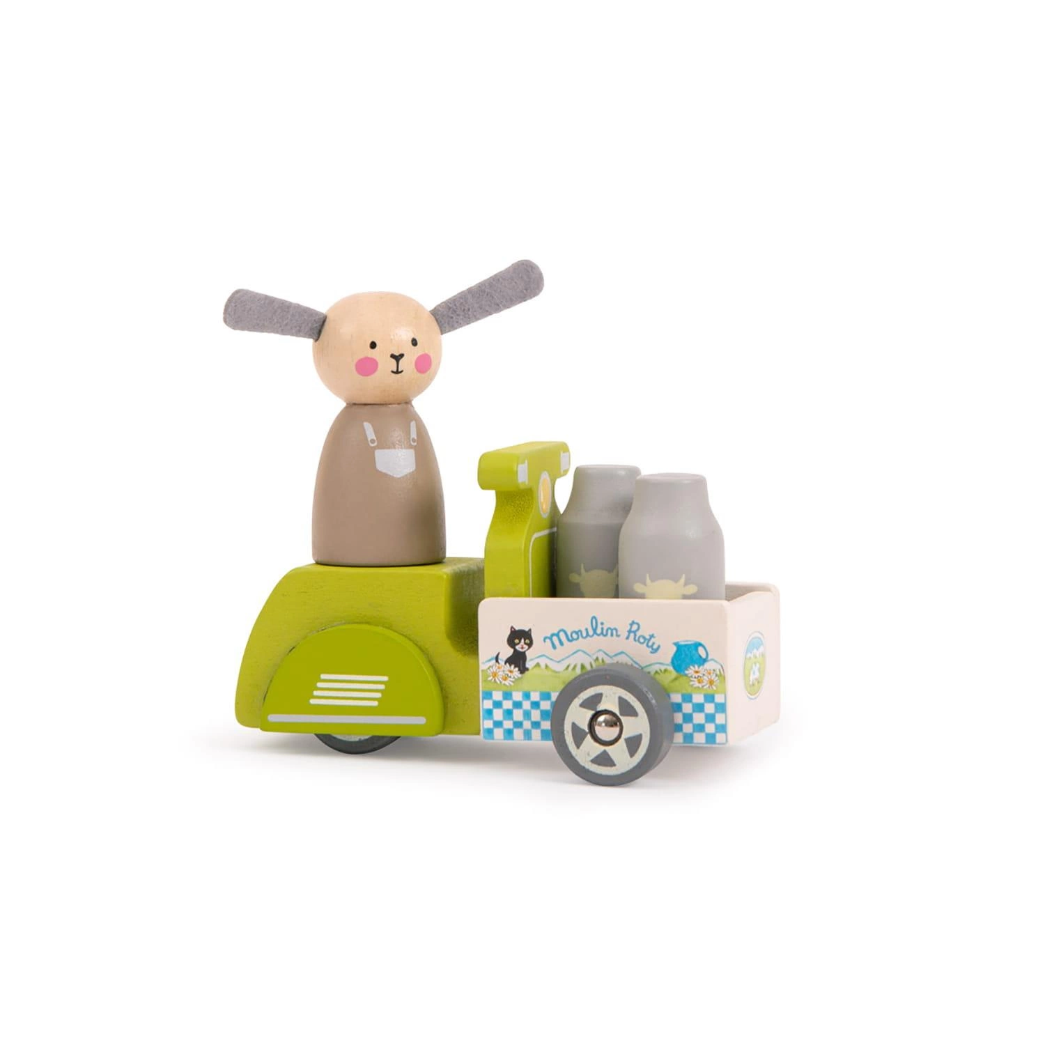 Drewniana owieczka Albert za pomocą swojego trójkołowego auta dostarczy