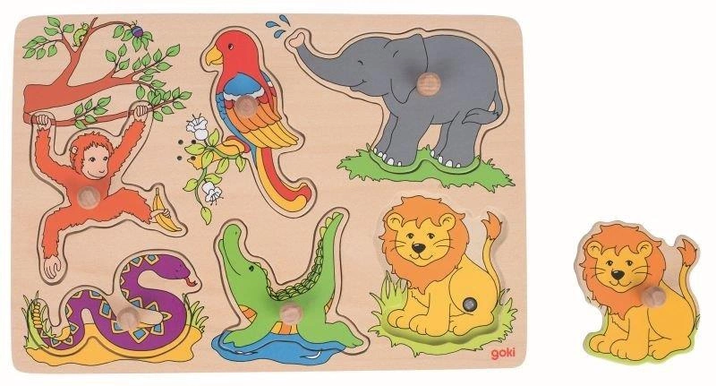 Układanka drewniana dla dzieci z uchwytami Goki "Egzotyczne zwierzęta". Każdy element układanki po włożeniu w odpowiednie miejsce wyda charakterystyczny dla danego zwierzęcia dźwięk. Zabawka Goki uczy rozpoznawania kształtów oraz naśladowania dźwięków.