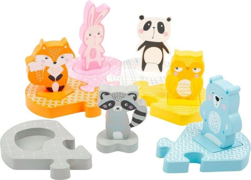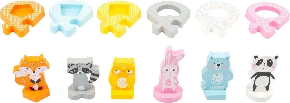 Komplet składa się z 12 elementów, 6 z nich stanowi komplet zawierający drewniane puzzle dla dzieci z geometrycznymi otworami, tworzą one podstawę w formie kwiatu. Pozostałe 6 figurek prezentuje różne urocze zwierzęta w pastelowych kolorach. Zadaniem maluchów jest ułożenie poszczególnych elementów w spójną całość. Drewniane figurki dla dzieci posiadają podstawy w kształcie odzwierciedlającym otwory na puzzlach, a kolory płatków kwiatu oraz poszczególnych postaci stanowią tutaj pewną odpowiedź.