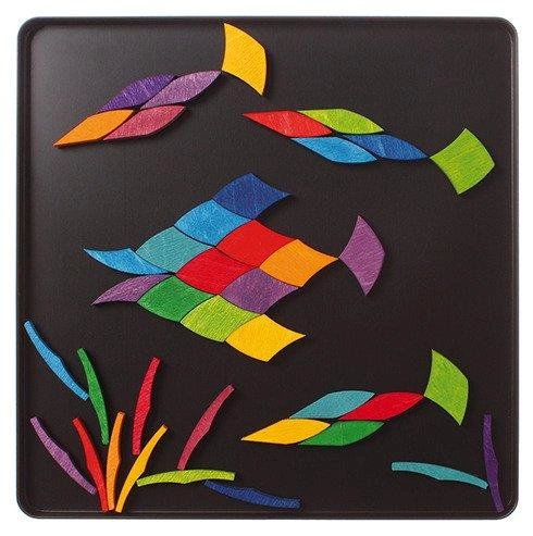 Układanka magnetyczna. Drewniane kolorowe klcoki Grimm’s o geometrycznych kształtach, w metalowym pudełku. Zestaw można łączyć z innymi magnetycznymi puzzlami Grimm’s tworząc rozbudowane kompozycje.