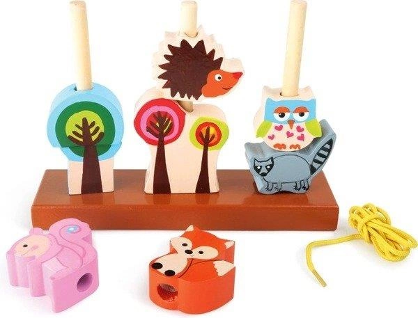 Układanka na palikach z klockami w kształcie leśnych zwierząt do nakładania na paliki wbudowane w podstawkę. W zestawie znajduje się dodatkowo żółty sznurek do nawlekania elementów.