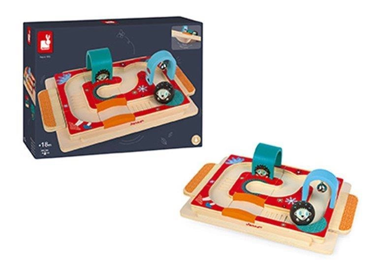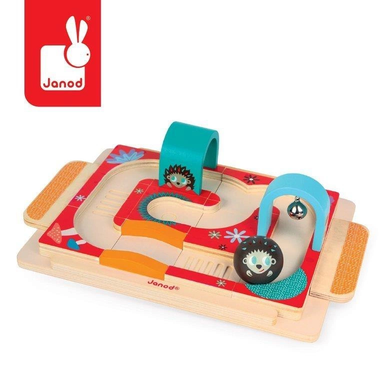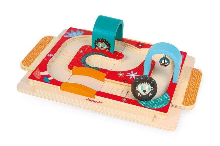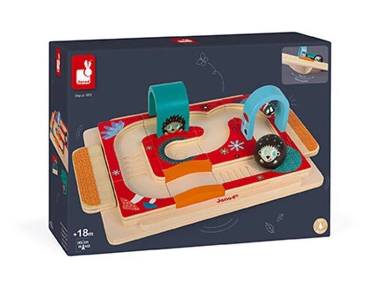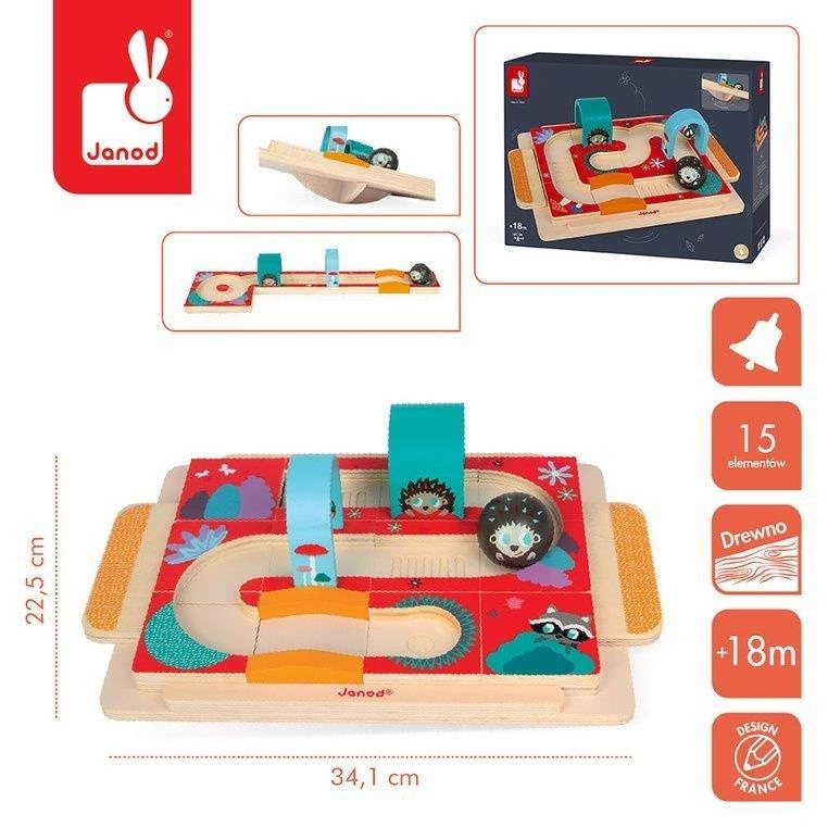 Drewniana układanka tor dla kuli Jeżyk francuskiej marki JANOD to idealna angażująca zabawka dla dzieci od 18. miesiąca życia. Zestaw składa się z 12 dwustronnych elementów, z których można budować różne tory do toczenia się drewnianej kulki – uroczego brązowego jeżyka z turkusowymi malowanymi kolcami. Tocząca się kulka musi pokonać po drodze różne przeszkody: wzniesienia, nierówności, tunele (w jednym z dwóch tuneli znajduje się dzwoneczek, który potrącony przez kulkę, wywołuje przyjemny dźwięk), ronda czy pochylnie. Klocki są poręczne i łatwe do układania przez dziecko. Wyższe brzegi toru zapobiegają wypadnięciu kulki z drogi, dzięki czemu nie zgubi się w trakcie zabawy. Zabawka została zaprojektowana we Francji. Zapakowana w estetyczne, kartonowe pudełko. Idealnie nadaje się na prezent.