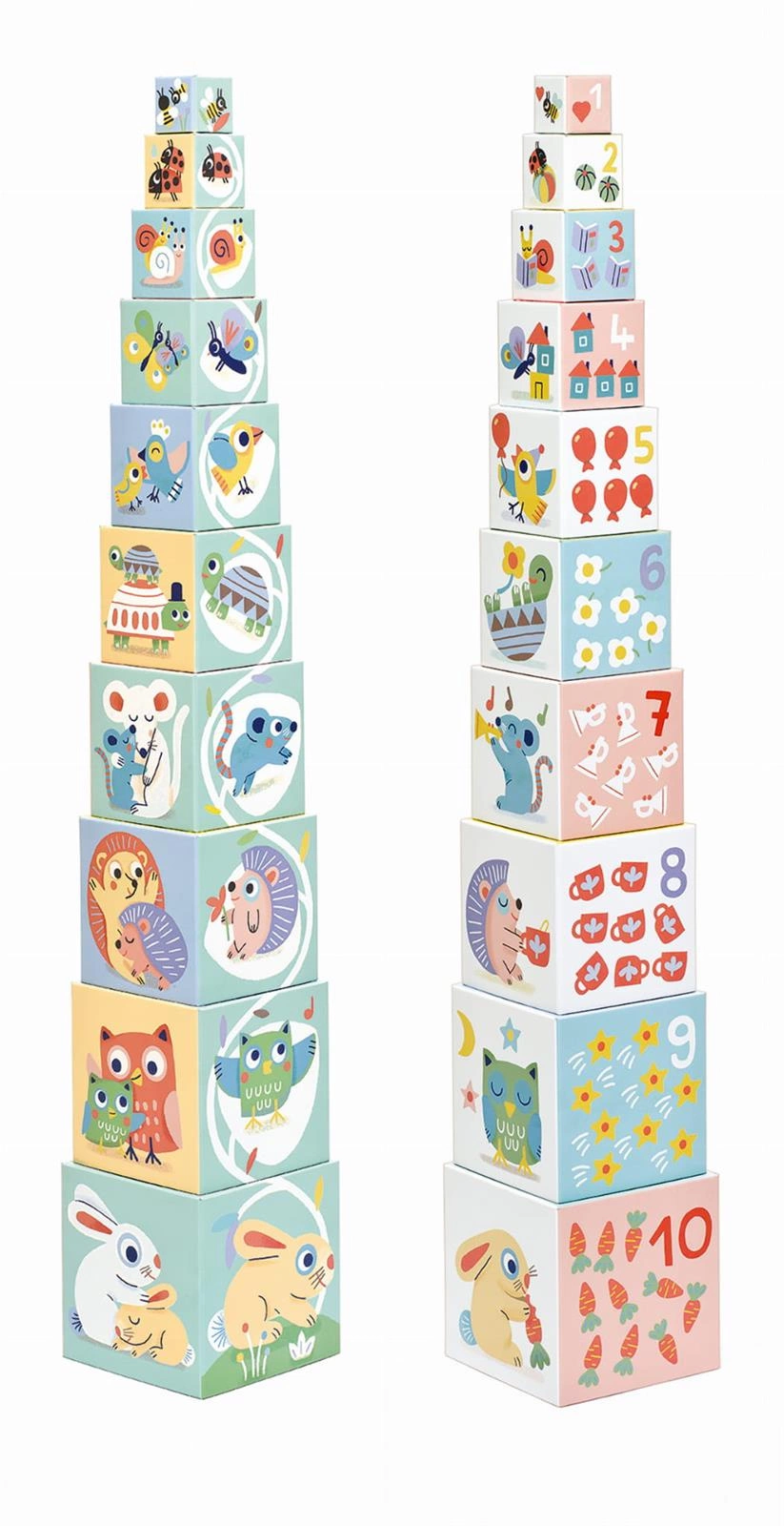 Klocki z firmy Djeco. Niesamowita zabawka dla małych i dużych... 10 pudełek z grubego kartonu ustawiamy w wieżę. Na jednej ścianie pojawią się wesołe zwierzaczki, na drugiej widzimy ukryte liczby- oglądamy, opowiadamy i pomagamy w nauce liczenia.