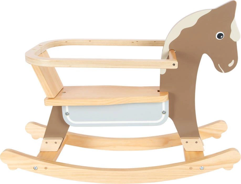 Minimalistyczny, drewniany konik na biegunach Small Foot to idealna zabawka dla maluszka, który uwielbia się bujać. Delikatna, neutralna kolorystyka w odcieniach brązu i naturalnego, jasnego drewna ozdobi każde wnętrze. Konik posiada bezpieczne płozy, których zakończenia są wyprofilowane w taki sposób, by uchronić przed upadkiem. Miejsce do siedzenia jest zabezpieczone wysokim oparciem – dzięki temu mamy pewność, że dziecko nie wypadnie podczas bujania. Możliwość demontażu barierki sprawia, że konik jest funkcjonalny i posłuży naszym pociechom na lata. Bujaczek jest bardzo poręczny oraz wygodny do przenoszenia, dlatego może towarzyszyć dziecku w każdym domowym wnętrzu i nie tylko.