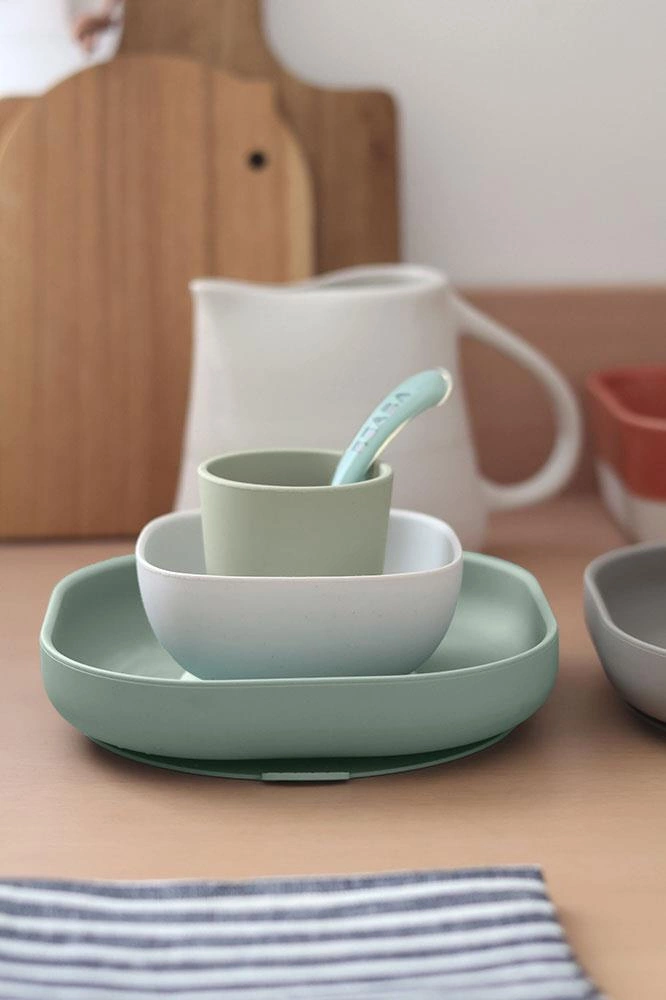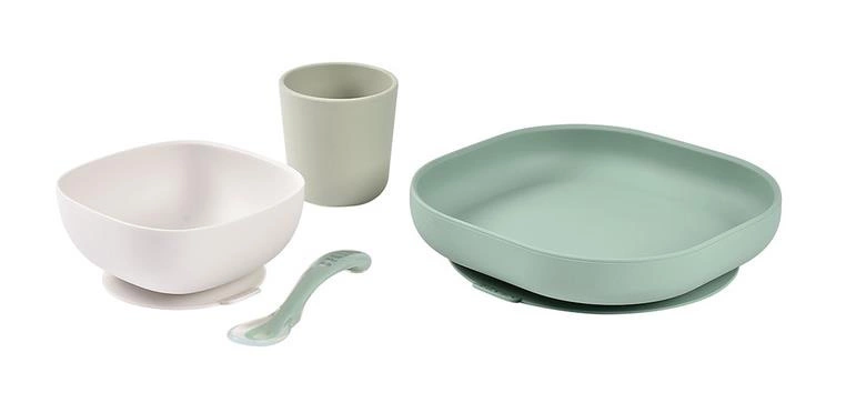 Komplet naczyń z silikonu francuskiej marki BEABA składa się z talerzyka, miseczki, kubka i łyżeczki treningowej. Wszystkie elementy zestawu charakteryzuje ergonomiczny, zaokrąglony kształt i miękkie, gładkie brzegi. Wyższe boki miseczki i talerzyka ułatwiają dziecku samodzielne nabieranie posiłku na widelec czy łyżkę. Naczynia te mają na spodzie antypoślizgową przyssawkę, dzięki czemu są stabilne i dobrze trzymają się stołu. Kubeczek jest poręczny i wygodny do nauki picia, a łyżeczka idealnie dopasowuje się do dziecięcej buzi i można ją odłożyć tak, by główka nie dotykała powierzchni, dzięki czemu jej używanie jest o wiele bardziej higieniczne.