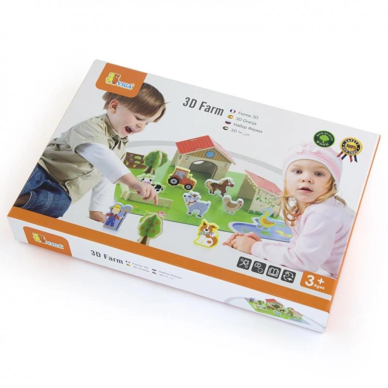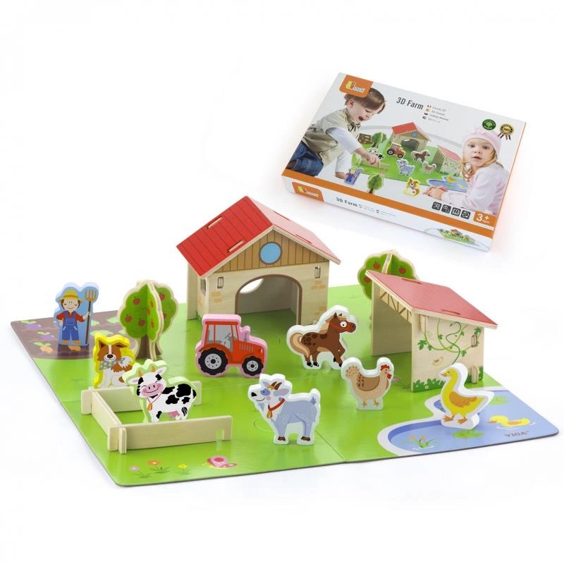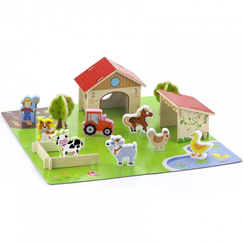 Zestaw Farma od marki Viga Toys zapewni dziecku kreatywną zabawę oraz nauczy, jak wygląda życie na wsi! Zestaw zawiera 30 elementów, w tym figurki zwierząt hodowlanych, stodołę, kurnik, krzewa, zagrodę, traktor i figurkę farmera. Cała farma jest zlokalizowana na planszy z namalowaną farmą. Sprawi, że maluch wcieli się w rolę farmera tworząc swoje gospodarstwo. Natura rozwinie u dziecka świadomość otaczającego go świata. Dzięki tej zabawce dziecko rozwinie, również wyobraźnie tworząc życie w swoim gospodarstwie sprawność manualną oraz koordynację ręka-oko. To świetna zabawa do której dołączyć może cała rodzina!