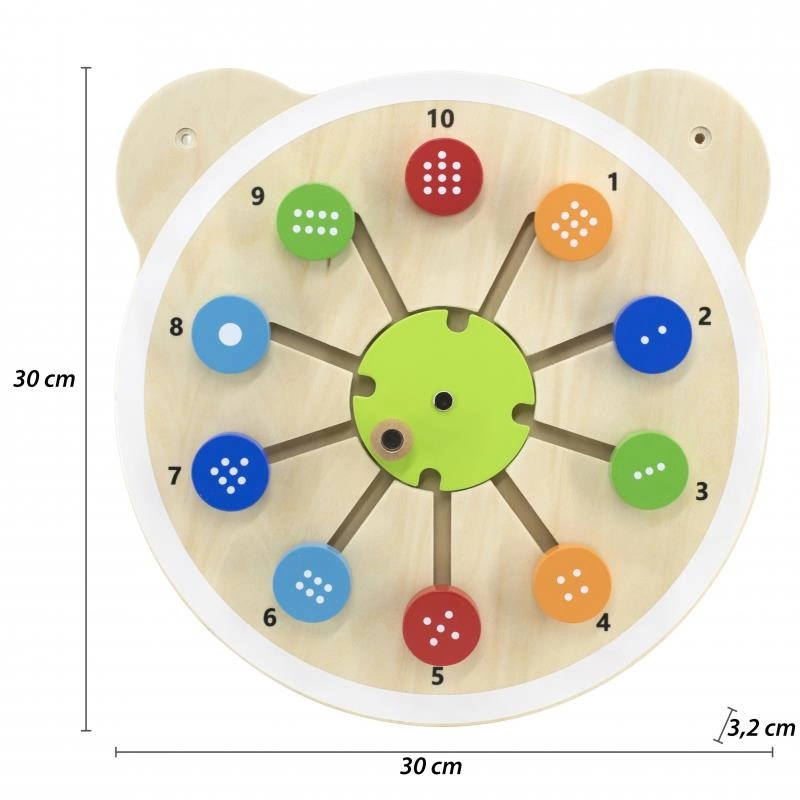 Jedna z serii drewnianych tablic z uroczą głową misia. Tablica z okrągłymi klockami, na których znajduje się odpowiednia liczba kropek, które należy dopasować do odpowiedniej cyfry na tablicy. Zabawka pomaga w rozwijaniu logicznego myślenia u dzieci, pomaga również w nauce kolorów i liczb. Produkt idealnie sprawdzi się zarówno w domowym zaciszu, jak i w placówkach oświatowych, wczesnoszkolnych. Ciekawe przygotowanie formy tablicy z pewnością przykuje uwagę każdego malucha. Całość wykonana została z drewna lakierowanego i pomalowana nietoksycznymi farbami w żywe barwy, które zadowolą każdego użytkownika i dadzą mnóstwo radości z zabawy. Produkt przeznaczony dla dzieci od 18 miesiąca życia. W naszej ofercie dostępna jest cała seria tablic z głową misia.
