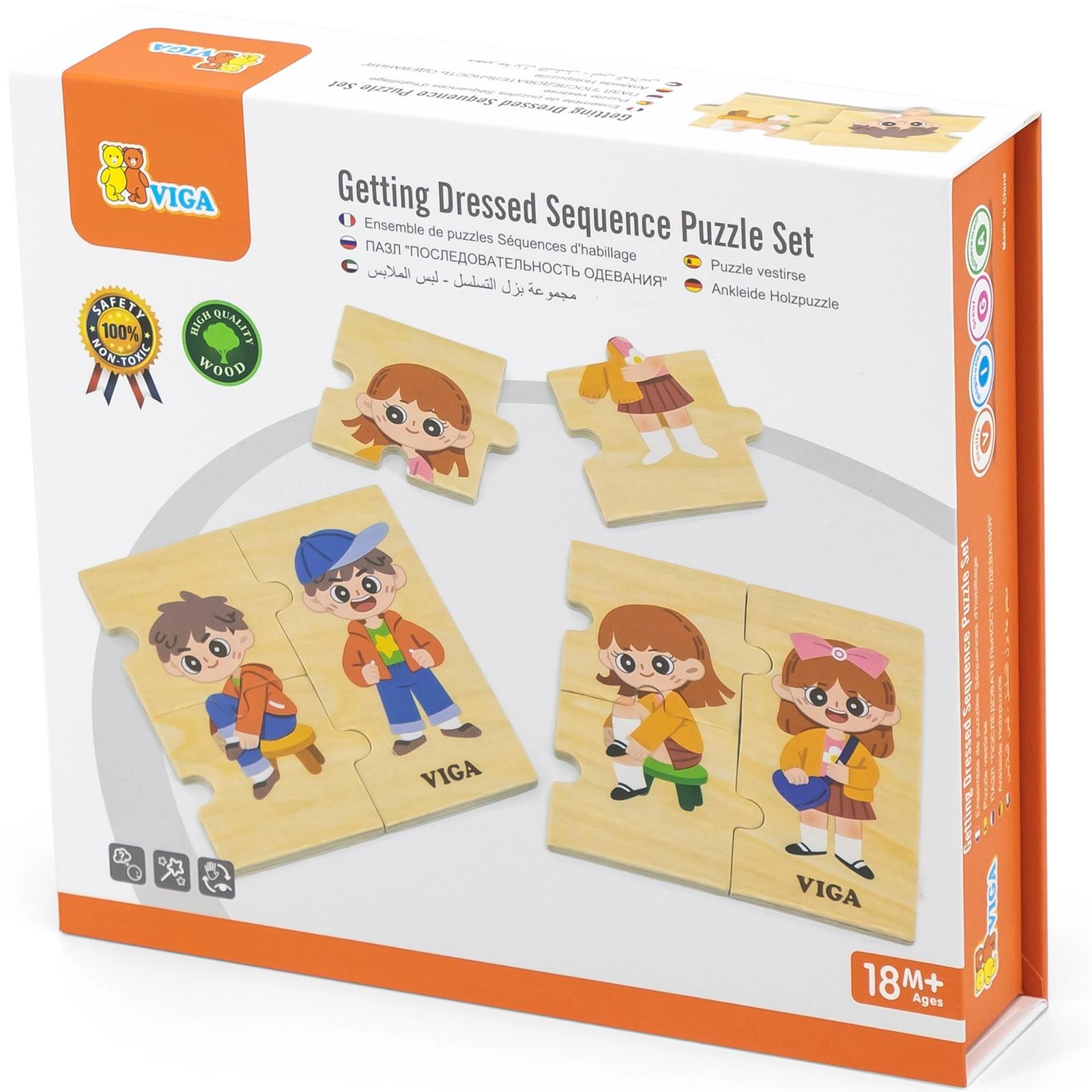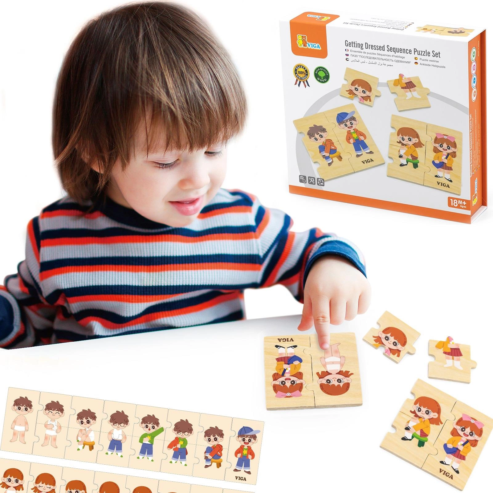 Ta edukacyjna układanka od marki VIGA składająca się z 28 części pomoże małym dzieciom nauczyć się ubierać we właściwej kolejności, co jest podstawową umiejętnością życiową wymaganą we wczesnym dzieciństwie. Drewniana konstrukcja układanki jest wytrzymała i bezpieczna dla dzieci. Części układanki są idealnie dopasowane do siebie.