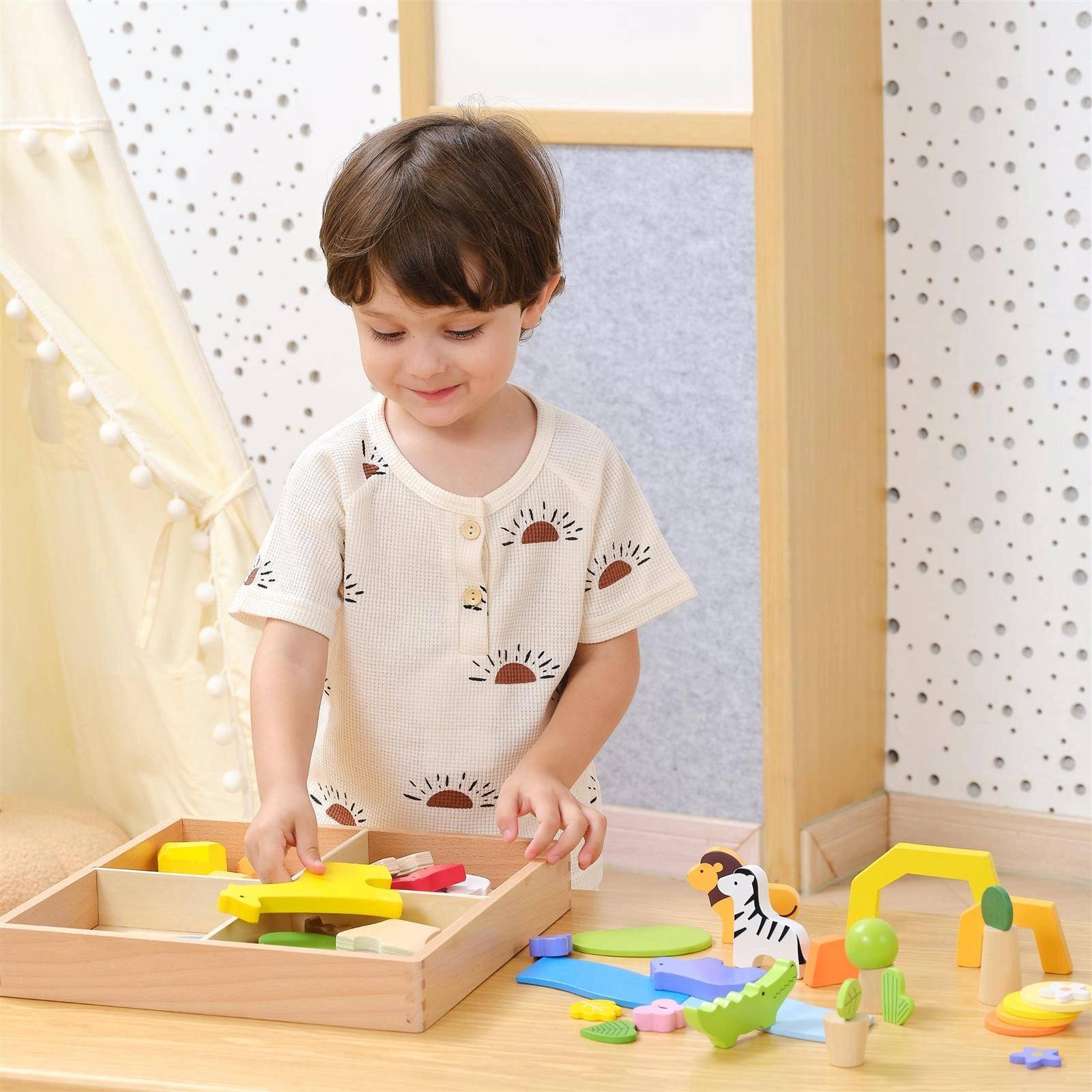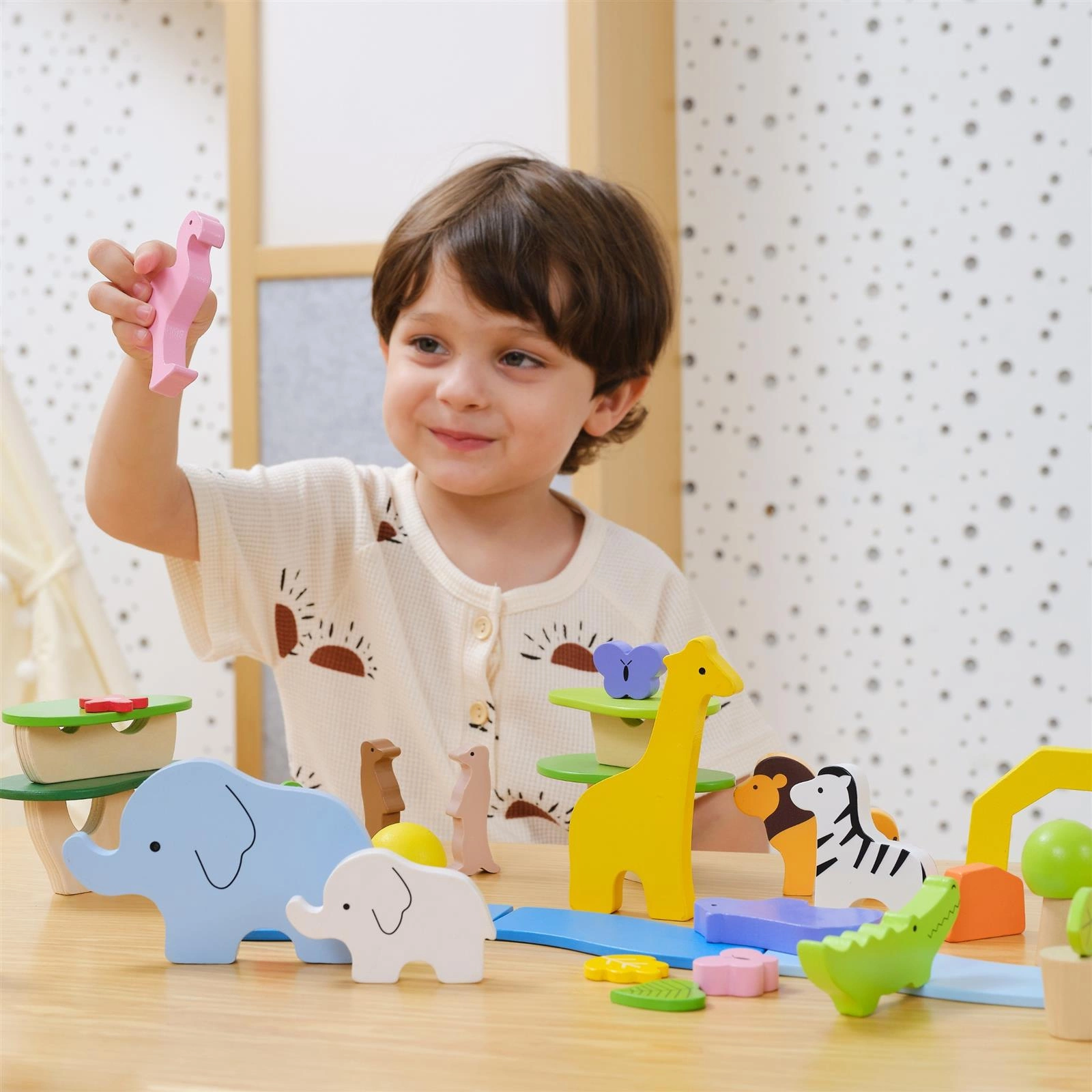 Przenieś swoje dziecko w świat afrykańskiej przygody z zestawem VIGA Kolorowe Klocki Opowieści Tropikalne! Ten niezwykle bogaty komplet, składający się z 55 drewnianych, luźnych elementów, to esencja swobodnej zabawy i nauki w duchu Montessori. Figurki zwierząt z sawanny – słonia, żyrafy, lwa i zebry – oraz elementy tropikalnej roślinności i rzeki, inspirują maluchy do tworzenia własnych scenariuszy i rozwijania kreatywności. Klocki wspierają małą motorykę i koncentrację, a dzięki wygodnemu, drewnianemu pudełku z przegródkami, sprzątanie jest równie łatwe jak zabawa.