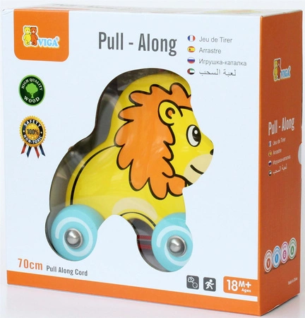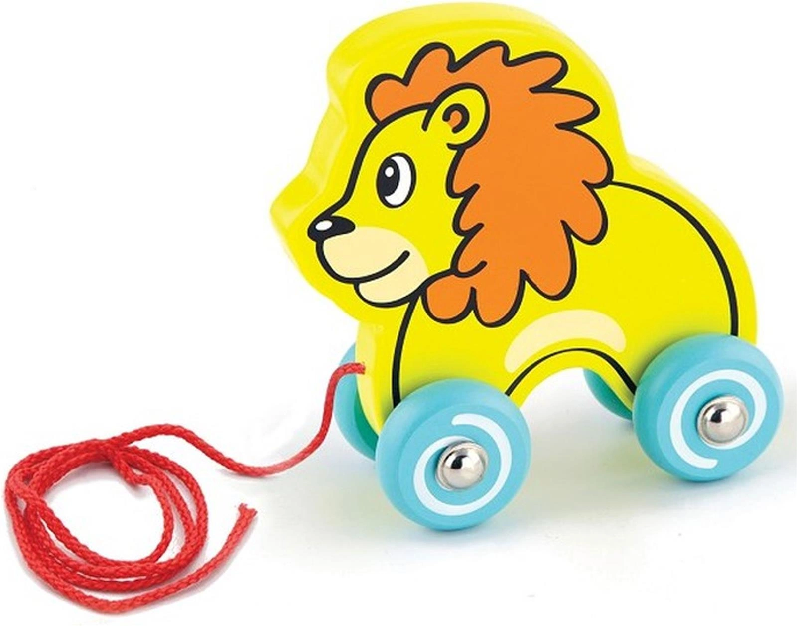 Kolorowy, drewniany lew na sznurku od firmy Viga to zabawka, która sprawdzi się jako pomoc u dzieci, które zaczynają stawiać pierwsze kroki. Wesoły lew będzie dla nich dodatkową atrakcją i zachętą do doskonalenia umiejętności chodzenia. Lew ma czerwony sznureczek, po pociągnięciu przez dziecko zwierzak porusza się w zabawny sposób, wydając przy tym dźwięki.