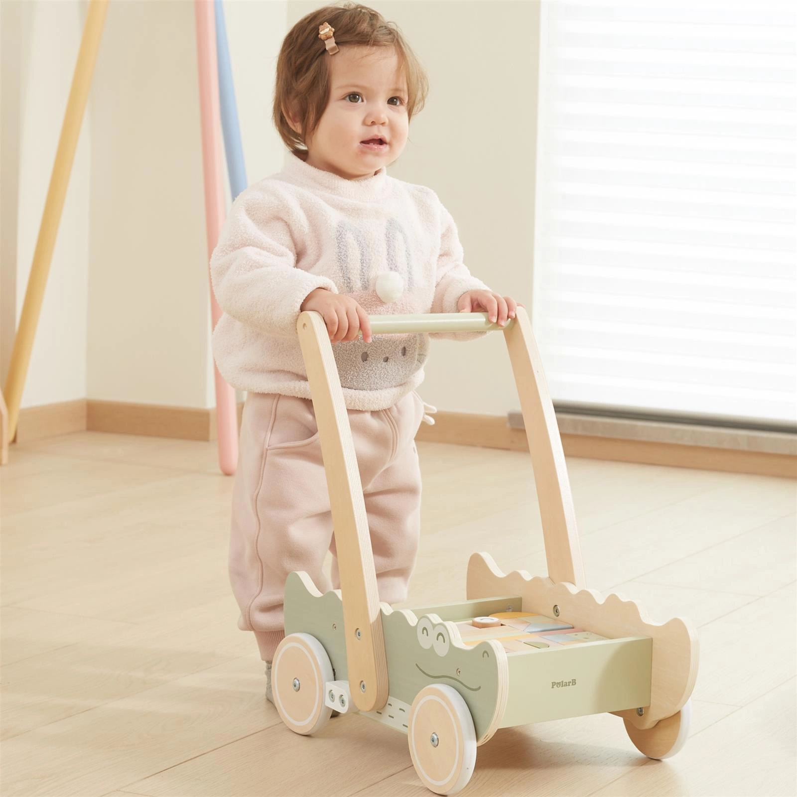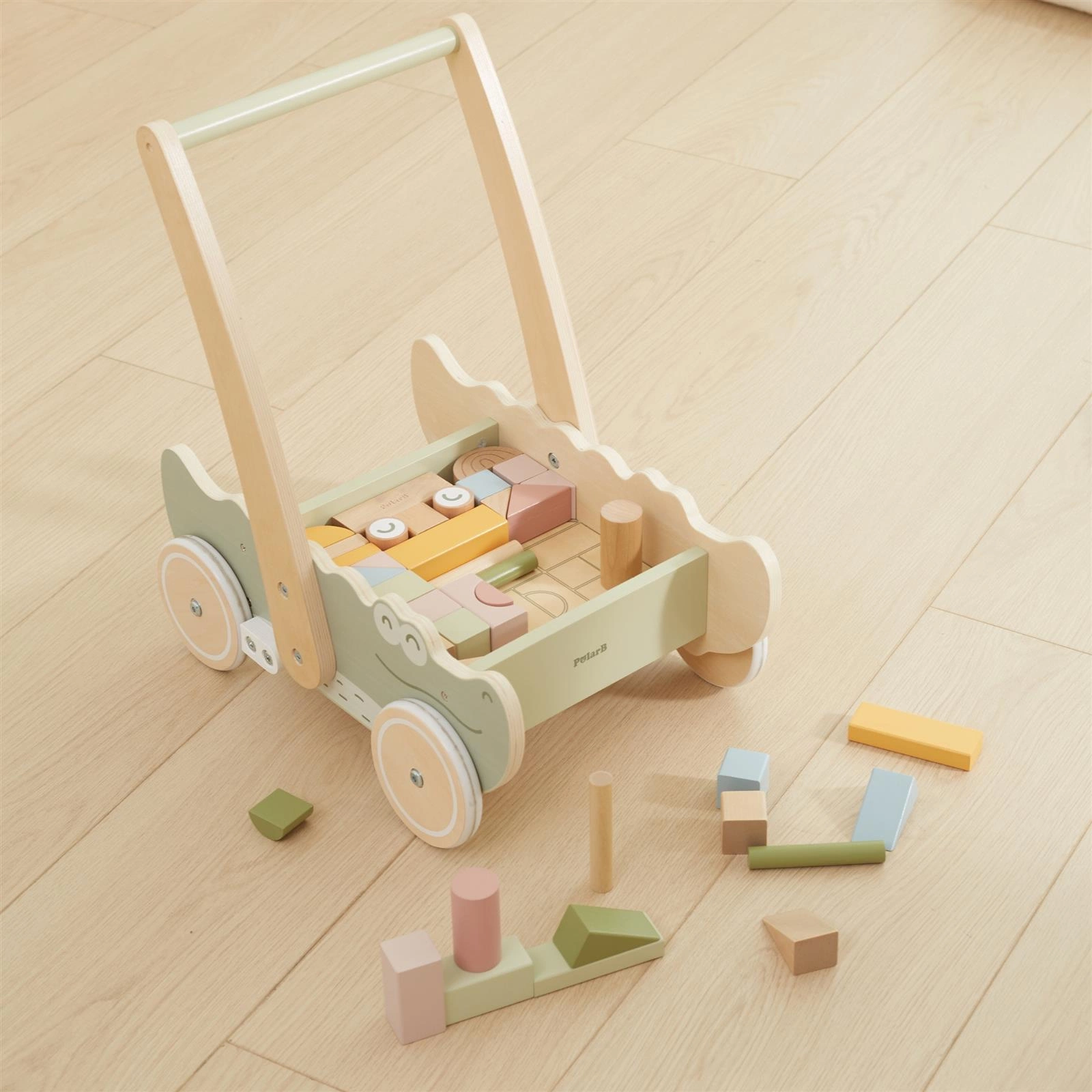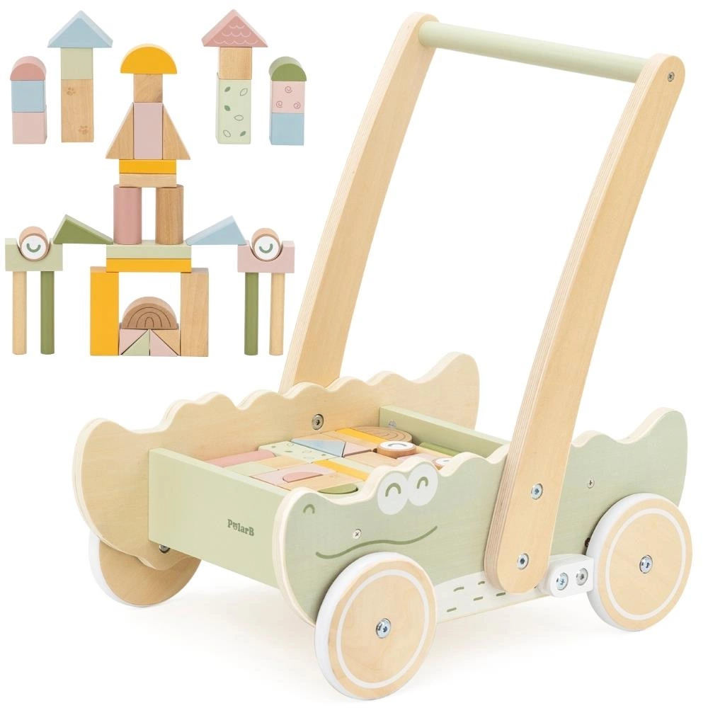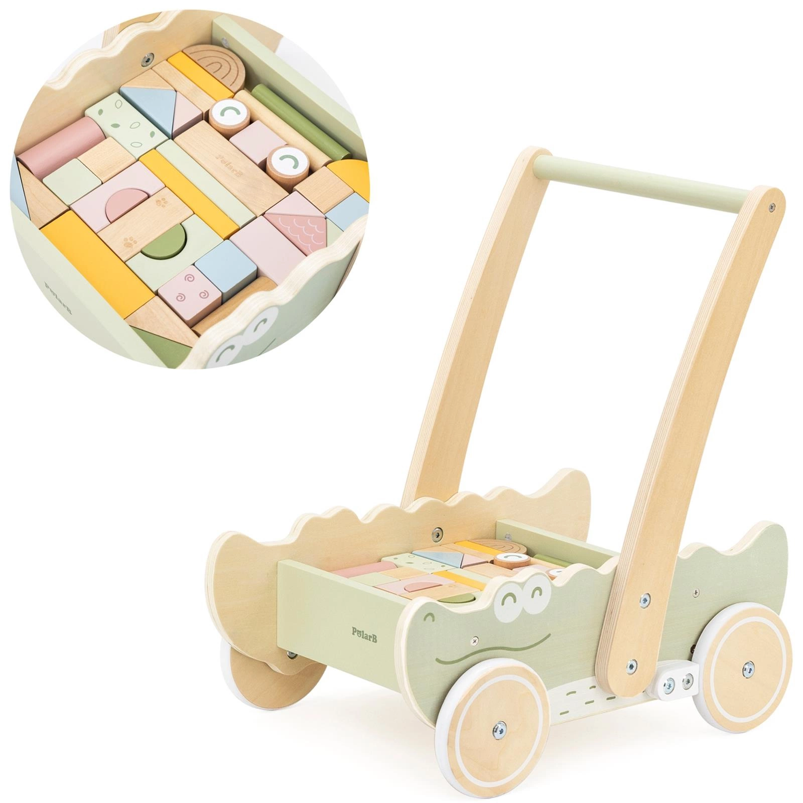 Odkryj radość pierwszych kroków z naszym uroczym chodzikiem-pchaczem w kształcie krokodyla! Ta wielofunkcyjna zabawka to idealny towarzysz rozwoju Twojego malucha. Stabilna konstrukcja i wygodny uchwyt zapewniają bezpieczne wsparcie podczas nauki chodzenia, a zestaw kolorowych klocków znajdujących się wewnątrz chodzika zachęca do kreatywnej zabawy i rozwijania motoryki.