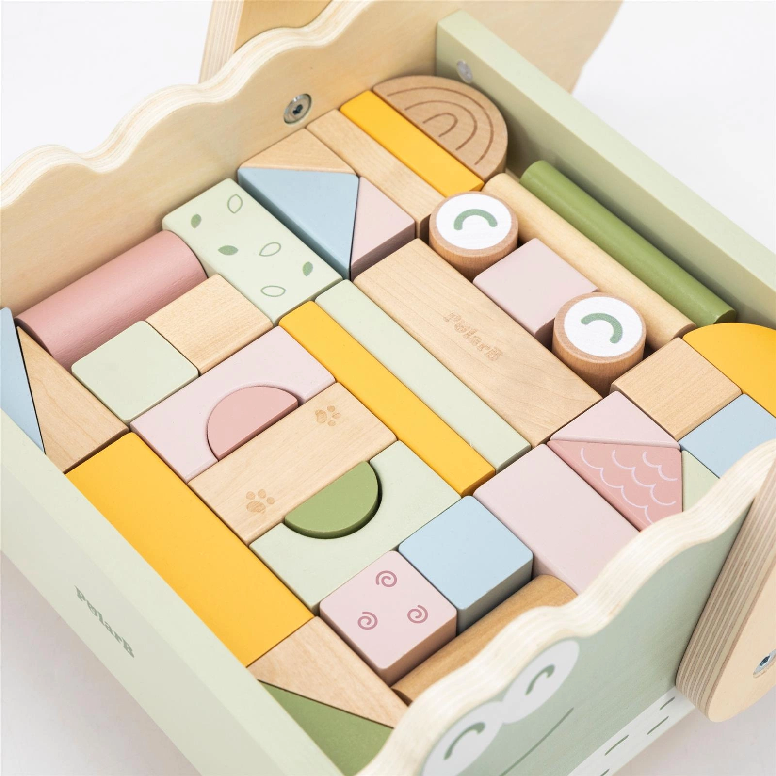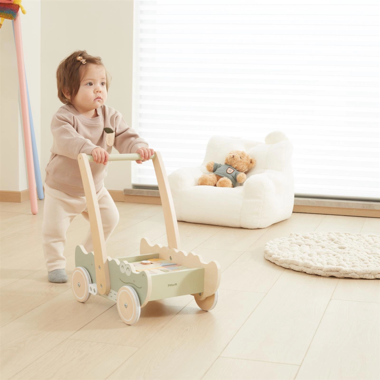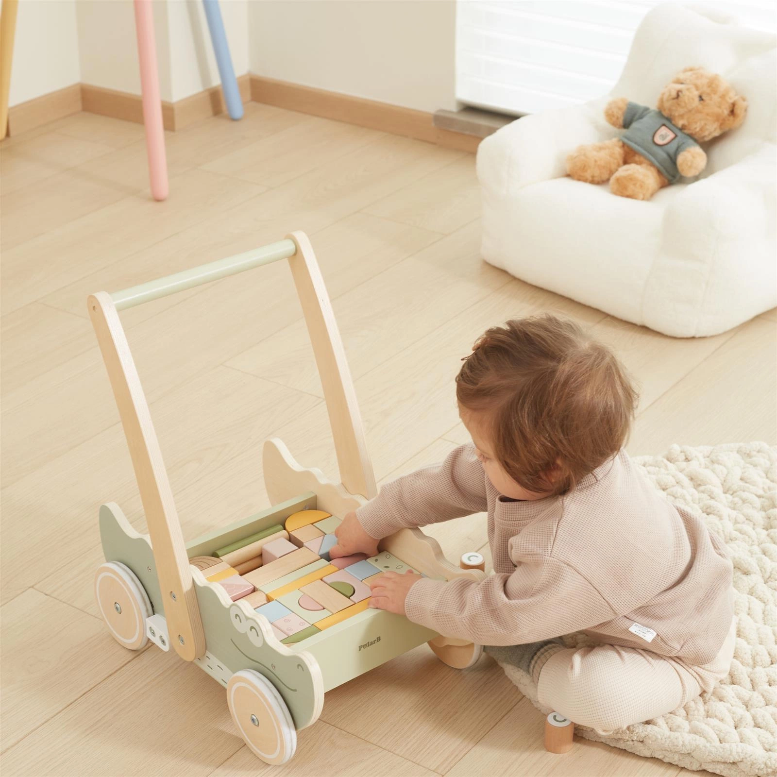 Odkryj radość pierwszych kroków z naszym uroczym chodzikiem-pchaczem w kształcie krokodyla! Ta wielofunkcyjna zabawka to idealny towarzysz rozwoju Twojego malucha. Stabilna konstrukcja i wygodny uchwyt zapewniają bezpieczne wsparcie podczas nauki chodzenia, a zestaw kolorowych klocków znajdujących się wewnątrz chodzika zachęca do kreatywnej zabawy i rozwijania motoryki.