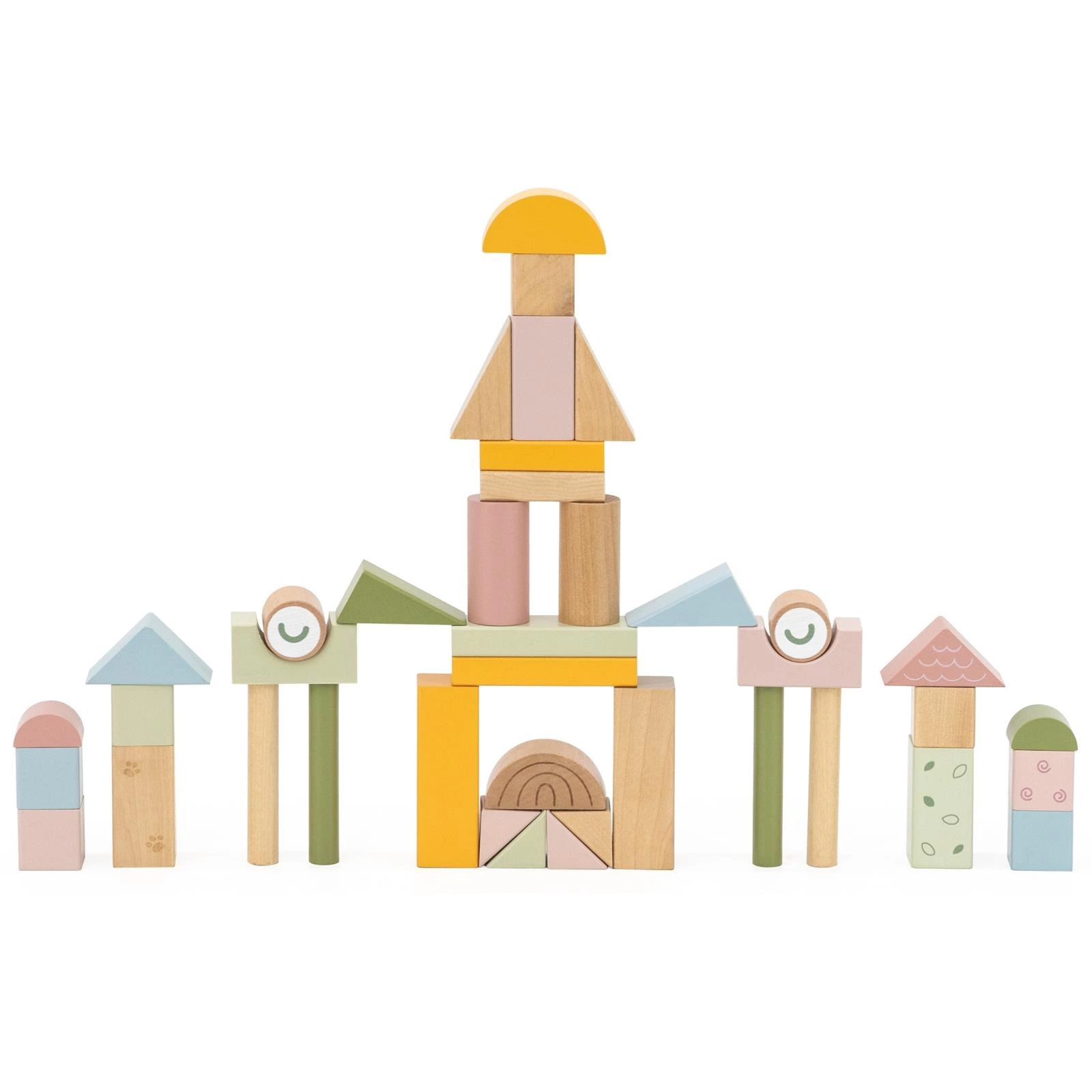 ✔️ Kolorowe klocki w zestawie – różnorodne kształty i pastelowe barwy zachęcają do kreatywnej zabawy.